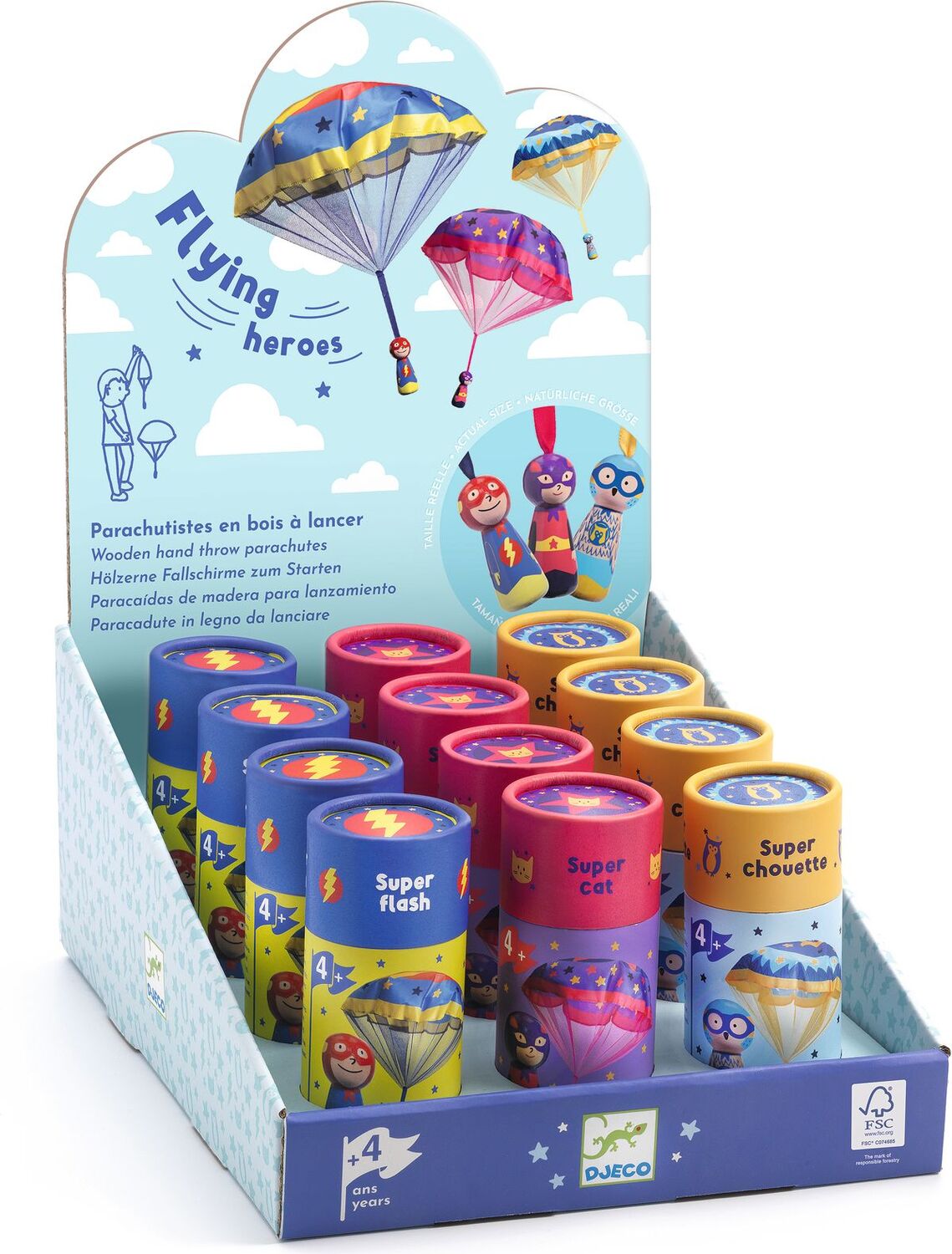 The Flying Heroes are little wooden hand-throwing parachutists: keep them in the air as long as possible! Super Flash, Super Cat and Super Chouette are each sold separately in lovely boxes. A modern take on a classic toy!