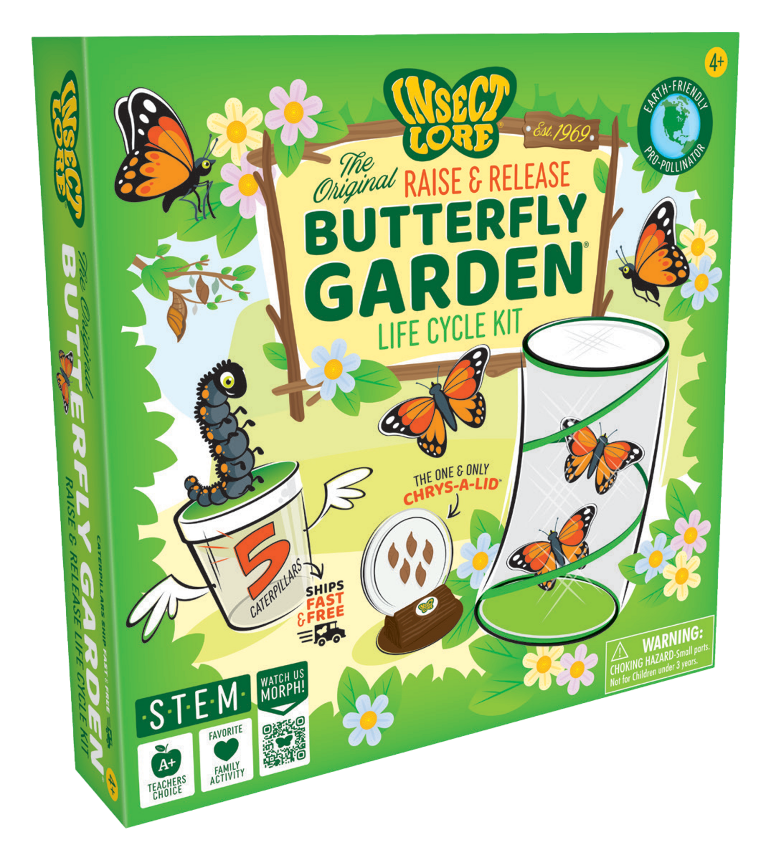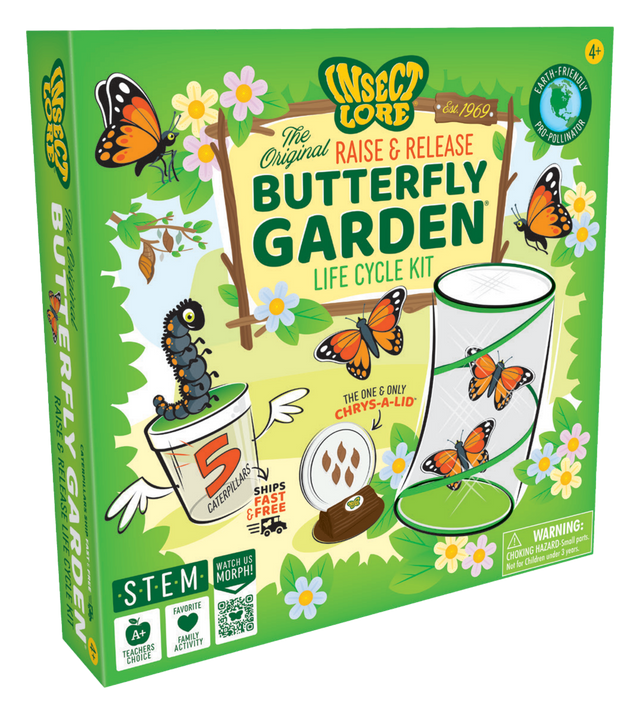 The whole family will want to see this! Fuzzy caterpillars transform to chrysalides, then to Painted Lady butterflies with the magic of metamorphosis. Don't worry, this kit does not contain live insects, but includes a voucher, to redeem at your convenience, for 5 baby caterpillars and all the food they need. Then watch as the caterpillars grow in the protective, reusable pop-up 12 in. tall habitat, to be let go as pollinators after emerging from their cocoons. An up-close garden of transformation. Fascinating - and beautiful.