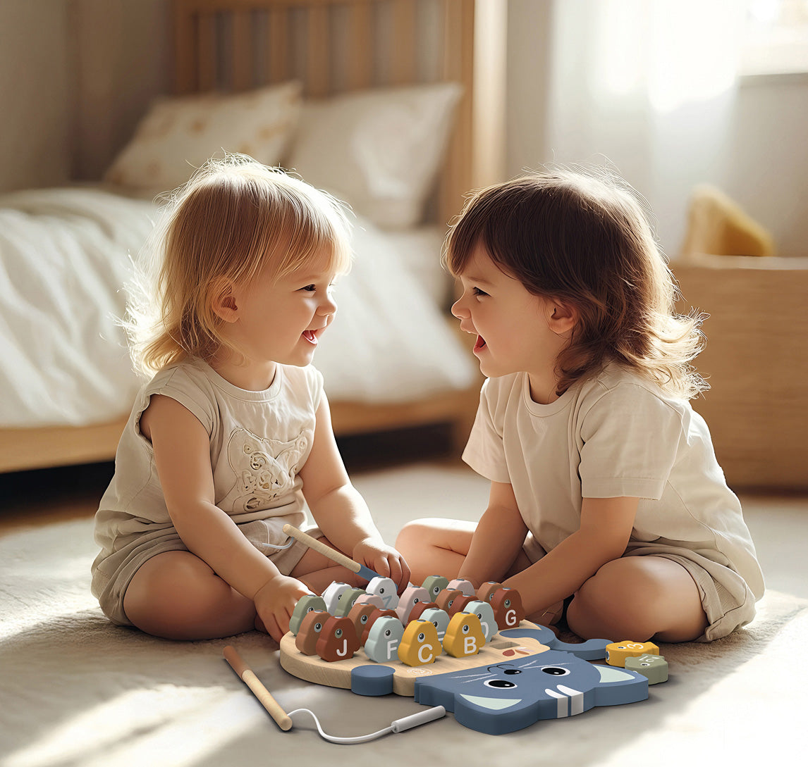 Each wooden fish features a brightly painted letter of the alphabet, helping children become familiar with letter shapes and sequencing in a playful, hands-on way. The magnetic fishing rods are easy to grip, encouraging hand-eye coordination and concentration.