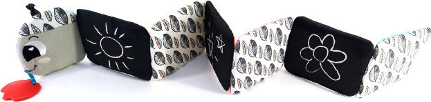 On one side, each accordion panel is bursting with bright colors, playful images, and exciting things to explore - like a hidden squeaker, unique fabric textures, and delightful crinkle sounds.