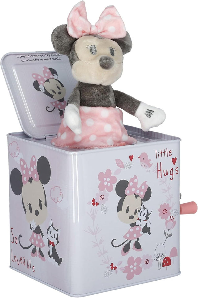 - Lasting Fun: Classic jack-in-the-box musical toy is made of durable, sturdy metal and a plush puppet pop up. Featuring artwork of Disney's Minnie in her pretty pink dress.