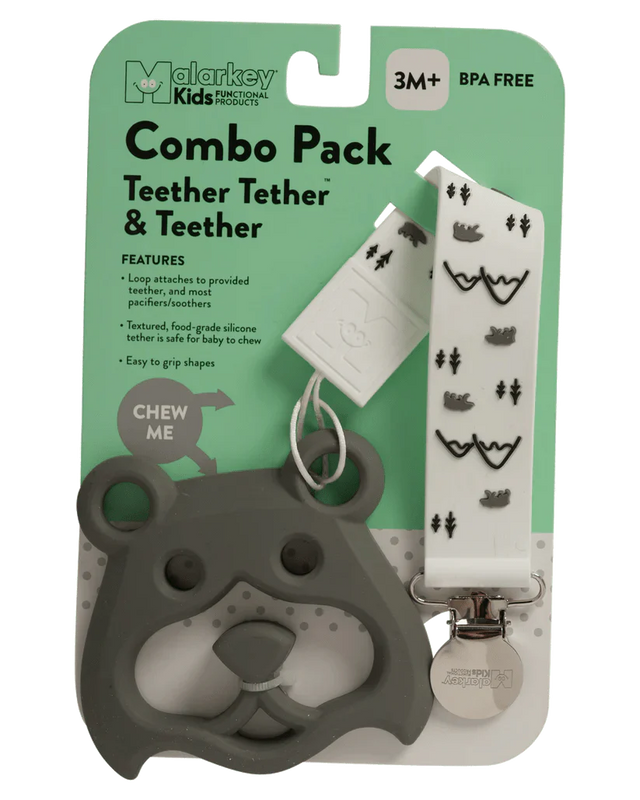 Teether Tether & Bear Teether. The Teether Tether and Teether is a multi-purpose teething toy. The teether comes in a number of fun shapes designed for easy gripping while the tether's patterns are textured to soothe baby and provide visual stimulation. Both teether and tether are made from soft, flexible, food-grade silicone with textures that gently massage baby's gums. The convenient clip attaches to all fabrics while the interchangeable loop attaches to most pacifiers and teethers keeping them close and clean.