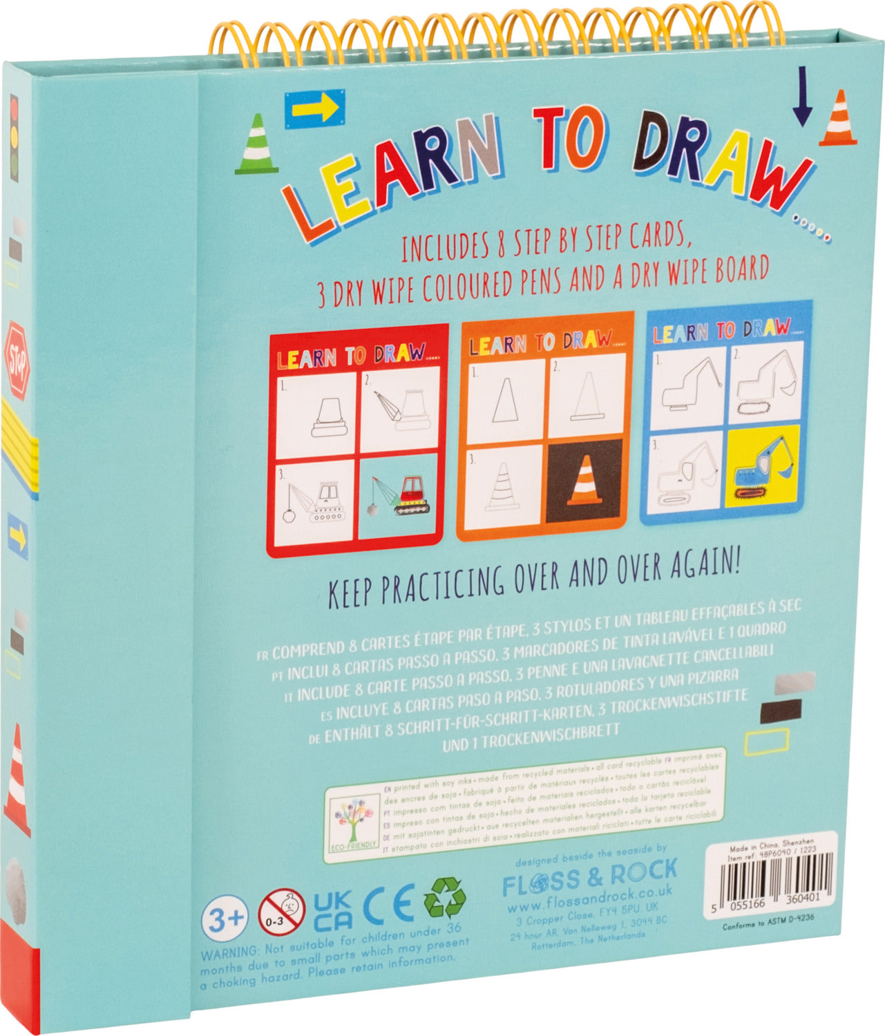 Become a budding artist with Floss & Rock's Construction themed Learn to Draw activity. Open the book to reveal 8 thick glossy pages, 3 color dry wipe pens with erasers and a draw and color section to copy the image. Each page has a 3 step guide as to how to draw your masterpiece! The book folds almost flat with a magnetic closure and is perfect for travel and taking out and about. Reusable over and over again.