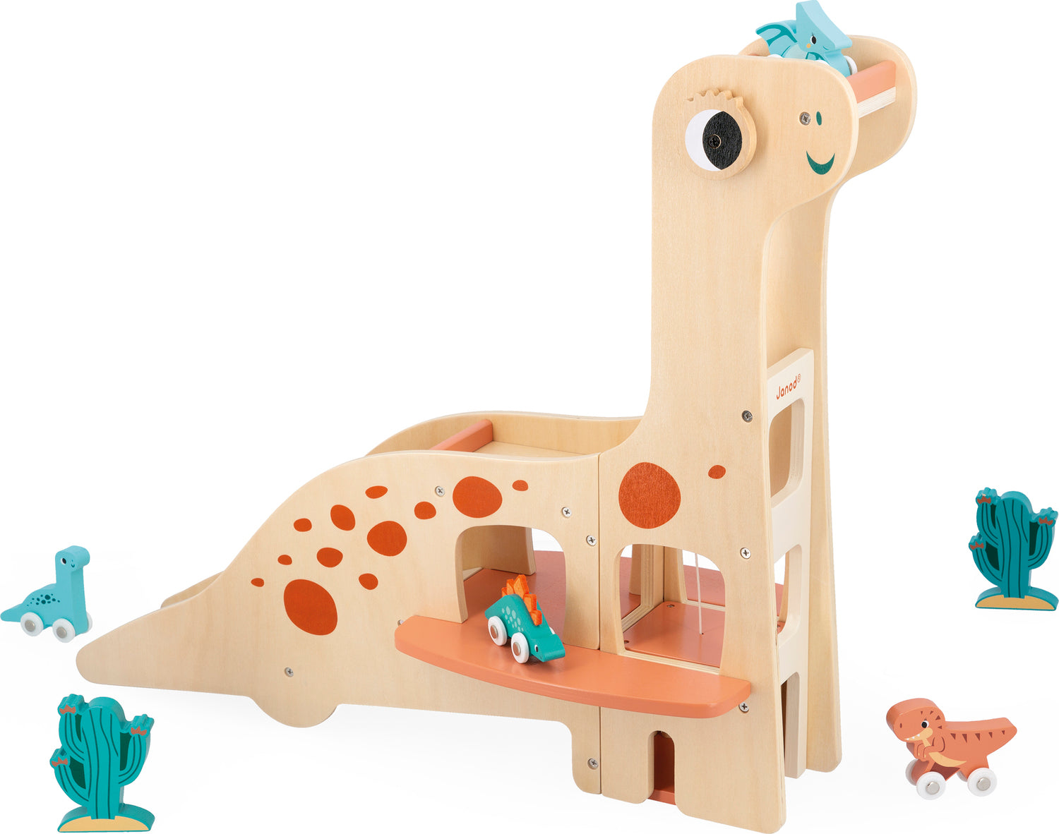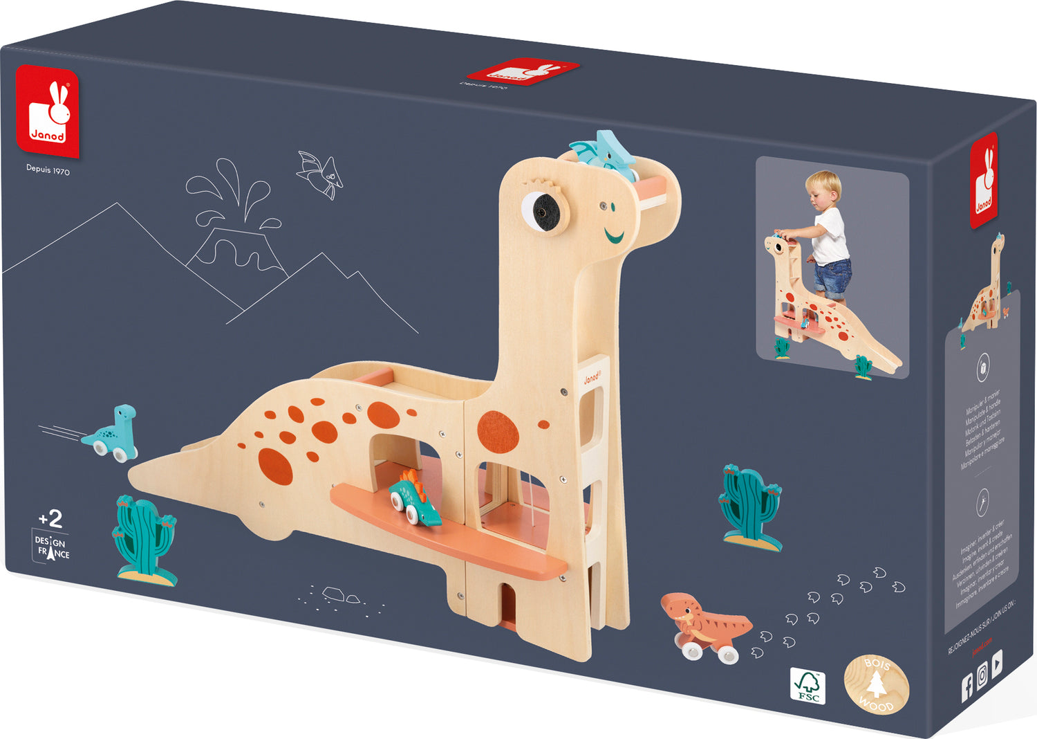 VRRRoom! Back to the pit for the T-rex! Here is a magnificent garage in the shape of a diplodocus. The 4 rolling dinosaurs can go off for a jaunt and come back to the garage to rest... The garage is equipped with a lift allowing direct access to the first and second floors. To get back down? There are two possibilities: a ramp serving as a slide for the more daring, or a lift for the less foolhardy. The little Pteranodon has its own private platform for landing directly on the garage roof. Two cacti are also included to decorate the surroundings. Ideal for developing imagination whilst having fun. Early learning toy made from FSCTM wood. For children aged 2 and over.