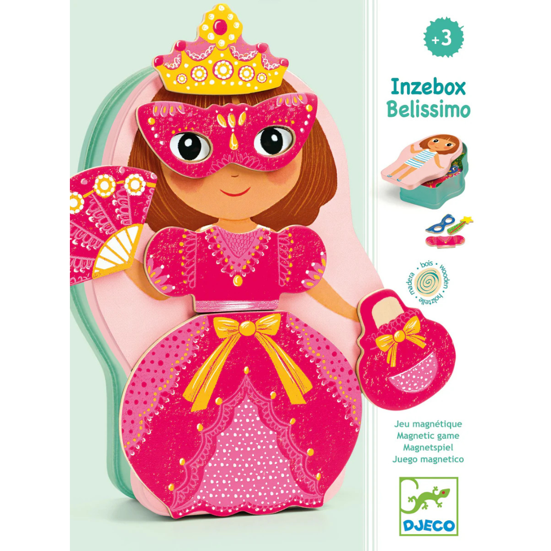 Contents: 1 princess-shaped metal box and 24 magnetic wooden pieces.