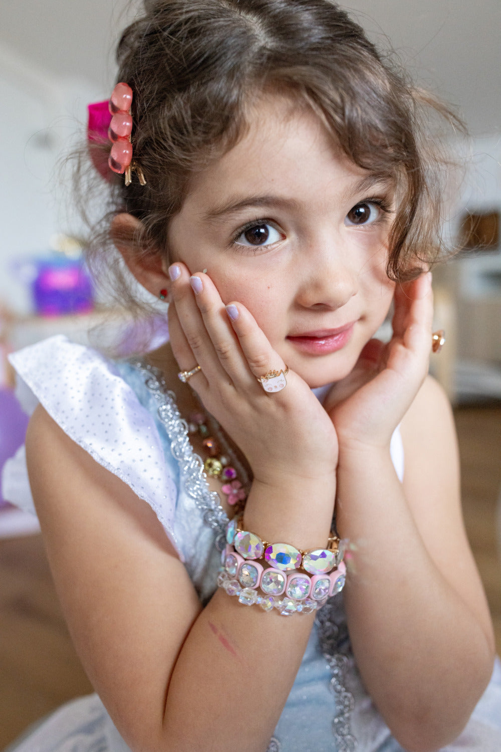 Great Pretenders' New Boutique Chic Aurora Borealis Gem Bracelet features a mesmerizing array of gems that reflect a dazzling iridescent effect reminiscent of the Northern Lights. These gorgeous beads are strung together with an elastic for a size-flexible fit.
