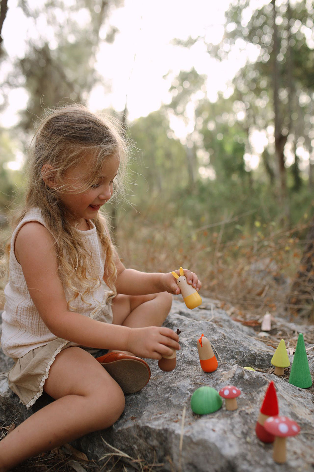 Invite your early learner into an enchanted forest filled with friendly dwarves, interesting animals, magical mushrooms, and fantastic trees! Inspire hours of open-ended imaginative play with this wooden and felt Waldorf playset. You'll be amazed at the storytelling potential of these heirloom quality pieces: 3 wooden animals, 3 mushrooms, 5 trees, 2 felt playmats, and 2 dwarves.