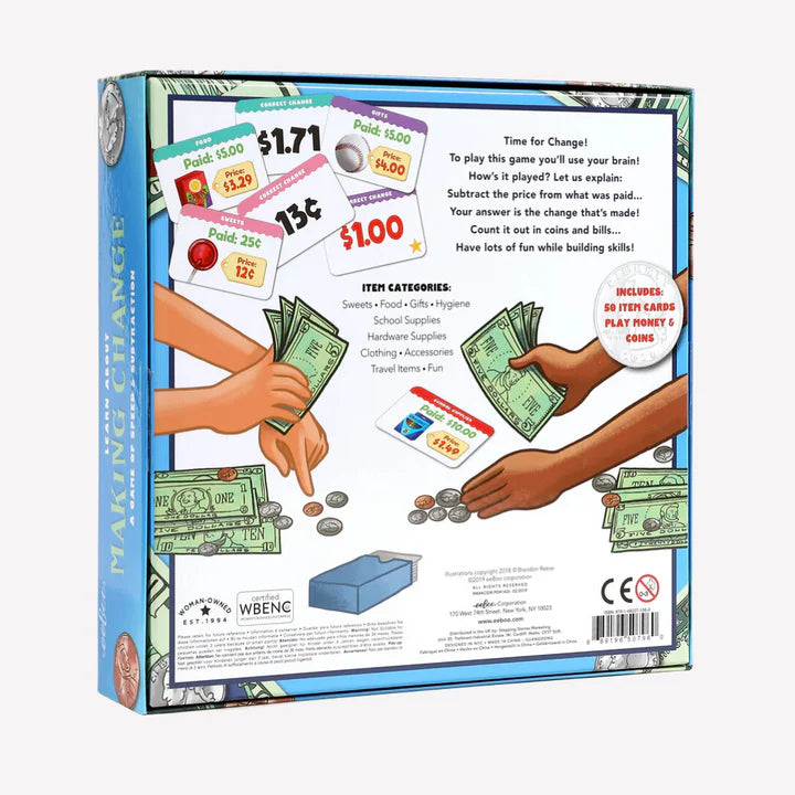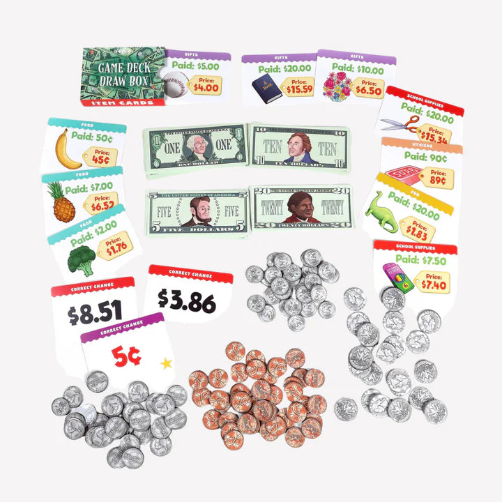 Making Change is a wonderful learning game where players use mental math to subtract the price of an item from the amount paid to make the correct change. Whoever collects the most items wins, get one item from each of 10 categories for bonus points. Fun and education for the whole family!