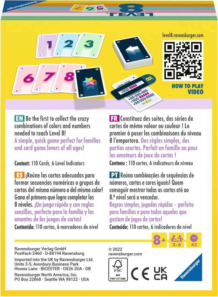 Be the first to collect the crazy combinations of colors and numbers needed to reach Level 8. A simple, quick game perfect for families and card game lovers of all ages! Race to collect pairs, triples, and runs of increasing difficulty as you level up. Complete Level 8 first to win!