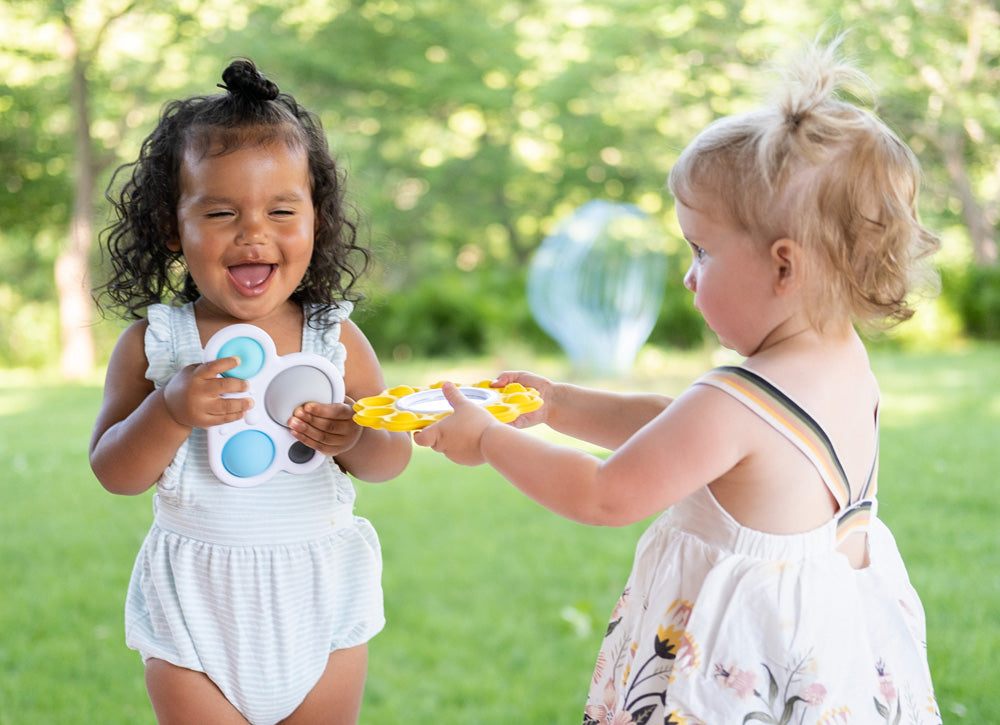 Colorful, squishy silicone 'bubbles' to pop, plus a double-sided mirror make this set of two sensory toys just perfect for engaging baby. The bubbles and outer ring are made of 100% food grade silicone, so they're even safe for teething.
