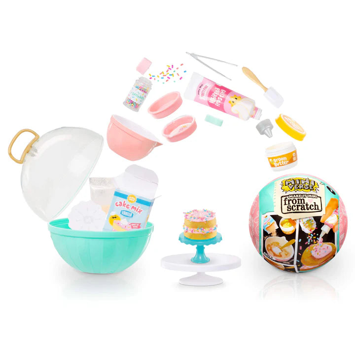 Each ball comes with realistic mini "ingredients" and accessories to make your own mini replicas of your favorite pastries and desserts "from scratch"! Each package is a SURPRISE, so you won't know which mini you have until you unbox it! Make it Mini from Scratch brings the fun of baking into the play process! Use "raw ingredients" to mix, layer, and build your sweet mini treat. Compare your ingredients with the included collector's guide to see which mini you’ve received and follow the "recipe" card on the back to make your creation.