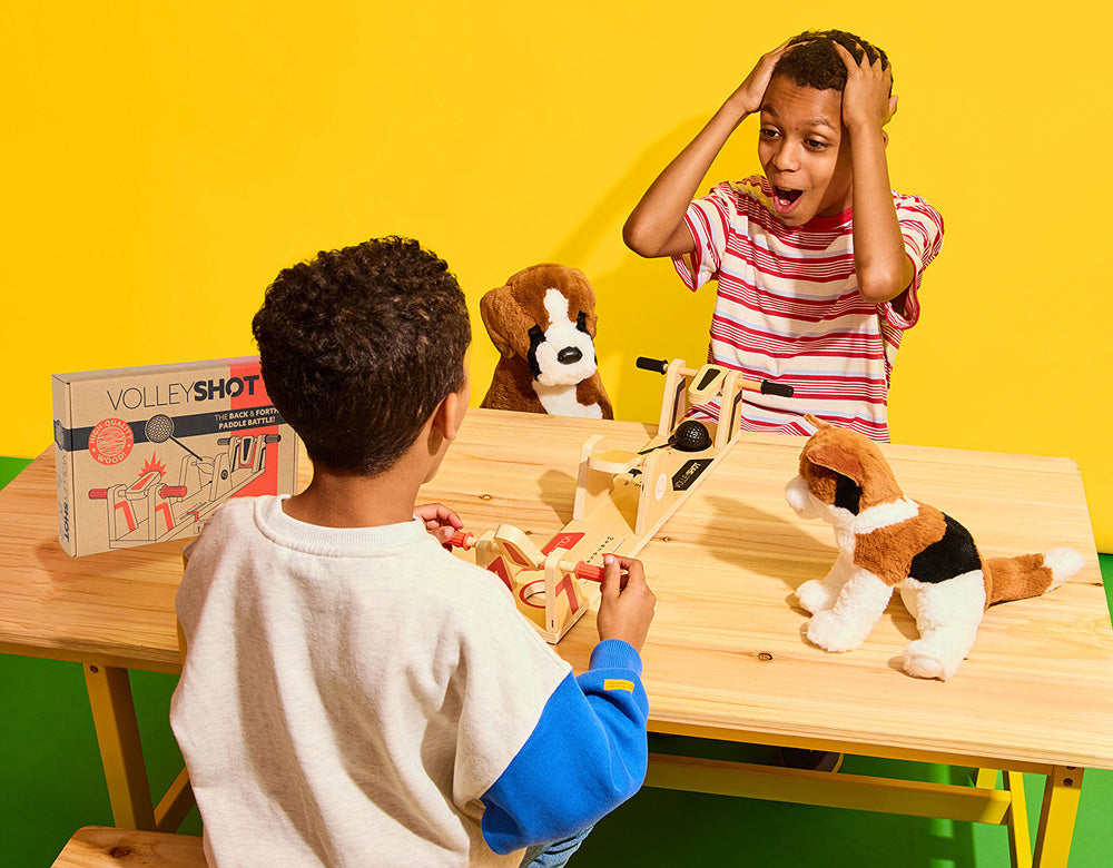 How long can you keep the volley going? In this game of table tennis meets foosball meets pinball, two players face off, each in control of a wooden paddle. Launch into competition, knocking the attached ball back and forth until somebody misses. Stay focused, stay steady... all it takes is a single hiccup to miss, and every miss is a point for your opponent. The first to 10 points wins! It's simple yet addictive, perfect for game nights, parties, or even on the go. For 2 players.