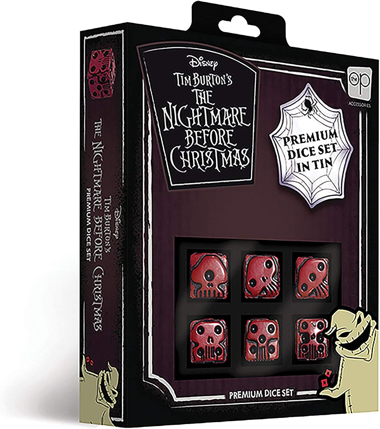 Tim Burton's The Nightmare before Christmas Premium Dice Set in Tin. Take the Boogeyman to your next game night with Disney Tim Burton’s The Nightmare Before Christmas Premium Dice Set in Tin! This underground lair-friendly collectible includes six-sided red and black custom sculpted dice, modeled with skulls after Oogie Boogie’s own, as seen in the haunting holiday film favorite.