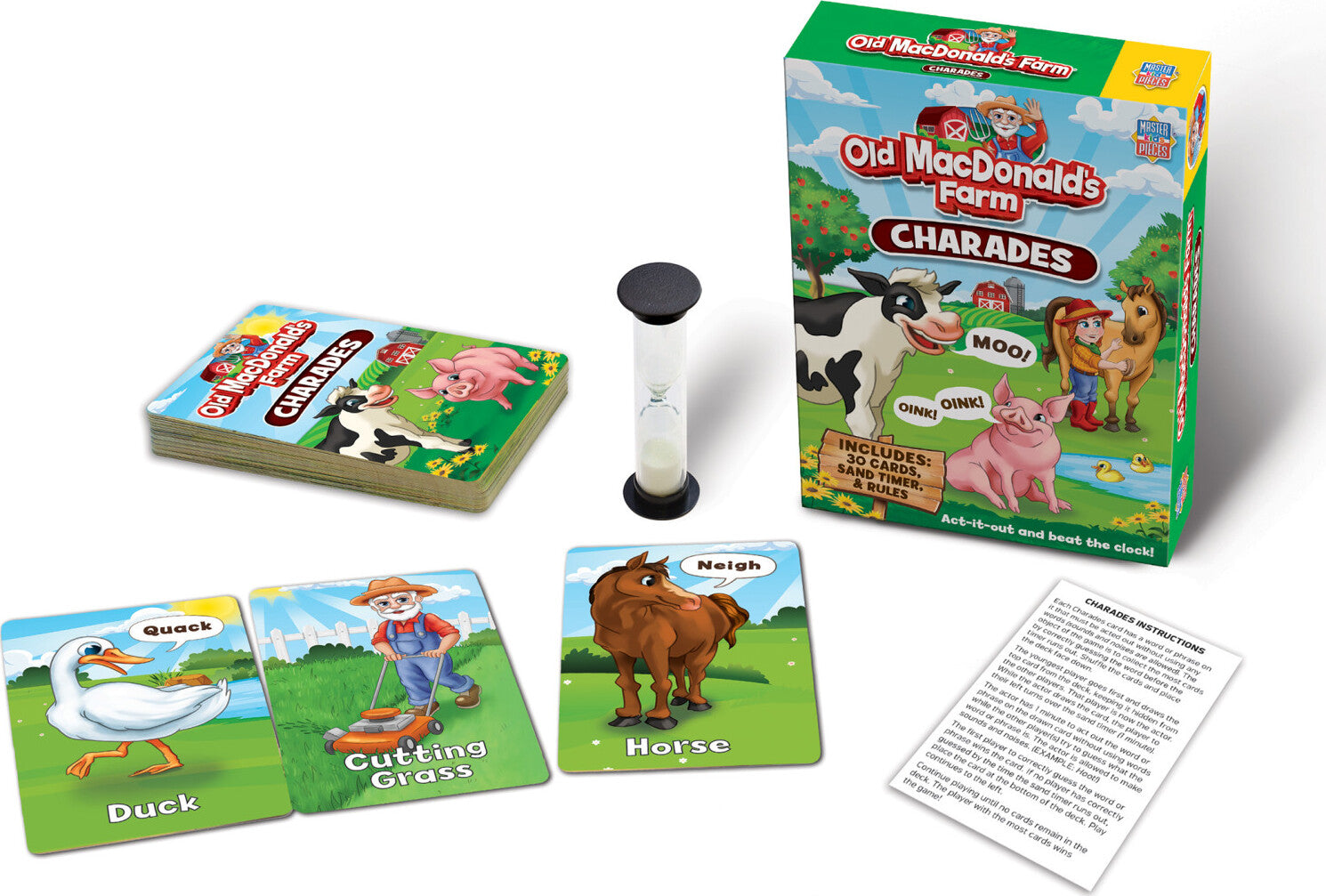Enjoy family game night with Old MacDonald's Farm Charades Game by MasterPieces. This game includes 29 charades cards with activities, animals, and farm fun. Act out the words or phrases on the cards. Collect the most cards to win the game! For 2+ players, ages 4+.