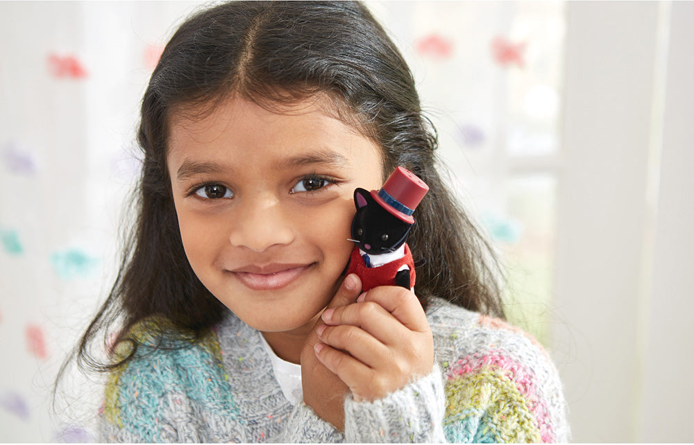 Imaginations soar in the pretend play world of Calico Critters. Get started or expand your collection with four soft, poseable black cats in removable clothing. Meet the Midnight Cat family: father James, a magician; mother Allison, a fortune teller; girl Chantelle, a collector of unique trinkets; and baby Reggie, who makes everyone giggle! Complete with celestial outfits and a top hat, this set sparks storytelling adventures for young learners. Combine with other Calico Critters sets for even more fun imaginative playtime!