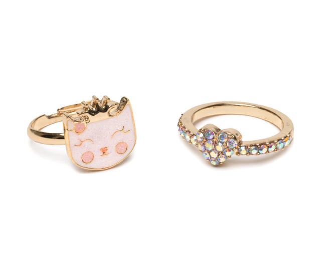 This adorable Boutique Kitty Love Ring Set includes one pink kitty ring and one rhinestone encrusted heart shaped ring, perfect for adding a touch of charm to any outfit.
