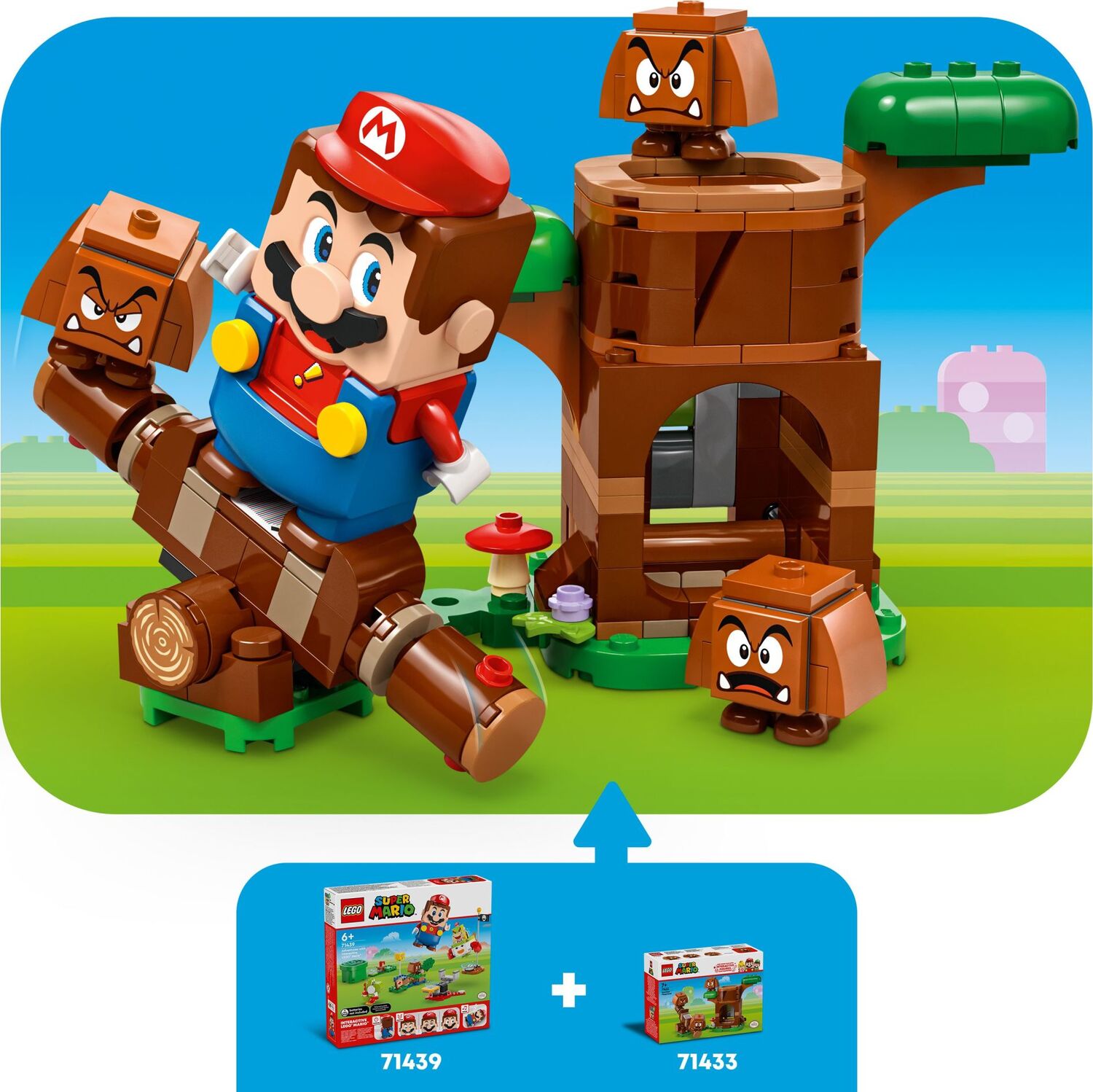 - LEGO® brick-built adventure toy – Press the lever at the back of the buildable tree trunk to make a Goomba pop out or play with the Goombas on the seesaw