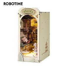 Falling Sakura Bookend. Robotime-Rolife Falling Sakura TGB05 is a creative self-assembly Book Nook kit in the form of a miniature house. We have offered you everything you need to build this mini cherry blossom wonderland - with all the wooden pieces and tools, and you will gradually recover the entire 'Falling Sakura' scene, such as the buildings, mountain valley, moon, trees, river, etc. You will feel the spring romance during the fun and immersive assembling process. After you finish, this Falling Sakura book nook kit will also be a unique and exquisite decoration for your bookshelf and office desk. It will look even more beautiful when you put it in the dark with the warm lights on.