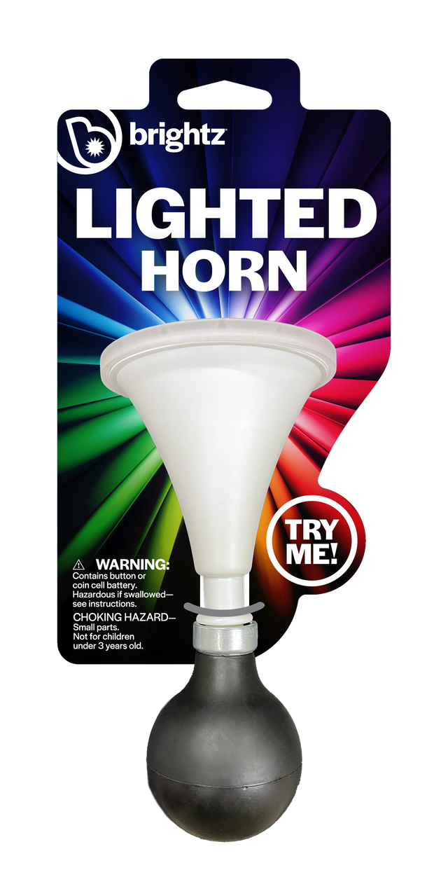 Add color and character to your ride with the Brightz LED Squish Horn: a light-up, squishy companion that brings fun and flair to any bike, scooter, or trike. This playful horn does more than just make noise... it shines! Just give it a squeeze to activate a vibrant LED light that morphs through the entire rainbow, turning heads wherever you go. It’s the perfect way to stand out and express your style at any age. The LED Squish Horn combines sound and light in one delightful package. With each honk, the rainbow-colored LED kicks on, creating a magical effect that kids and adults alike will love. Installation is quick and easy with a built-in thumbscrew that securely attaches the horn to most handlebars. No tools needed. It comes ready to ride with two CR2032 batteries included, offering up to five hours of light-up fun straight out of the package.