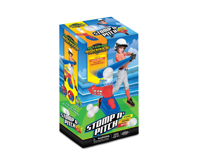 STOMP, SWING, & HIT: Introducing Stomp Sports Stomp ‘N Pitch, from the makers of Stomp Rocket! Stomp ‘N Pitch is designed for kids that are ready to graduate from tee ball and practice hitting a moving target. Kids can practice independently for hours of fun while honing in on their skills! Includes Ball Launcher, 5 Balls, and an easy-grip Collapsible Bat. Recommended for ages 6 and up.