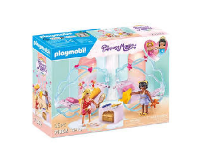 Princess Magic Slumber Party in the Clouds. After a wild pillow fight, the wonderful swinning beds gently lull the best friends to sleep. Have a fun playtime above the clouds with the Princess Party in the Clouds from PLAYMOBIL. Before the two rainbow princesses snuggle up in their cloud swing beds, they decorate them with sparkling gems. Then they slip under the covers and off they go into the realm of dreams.