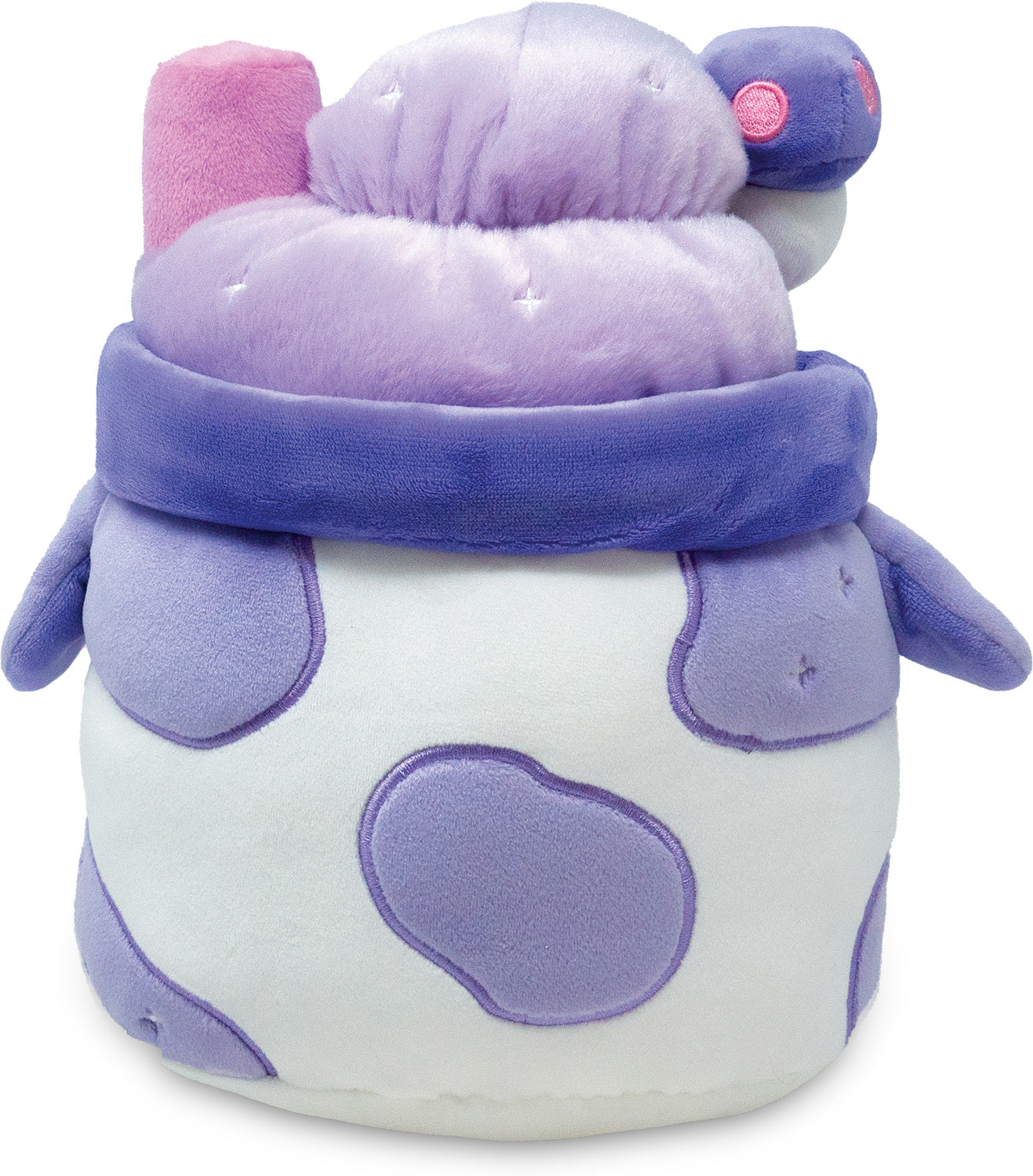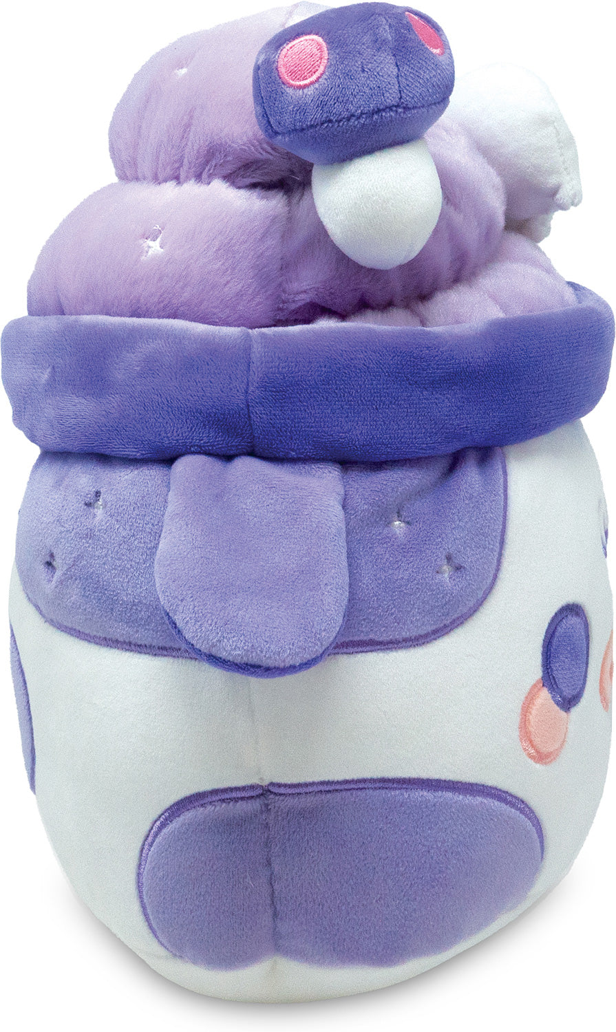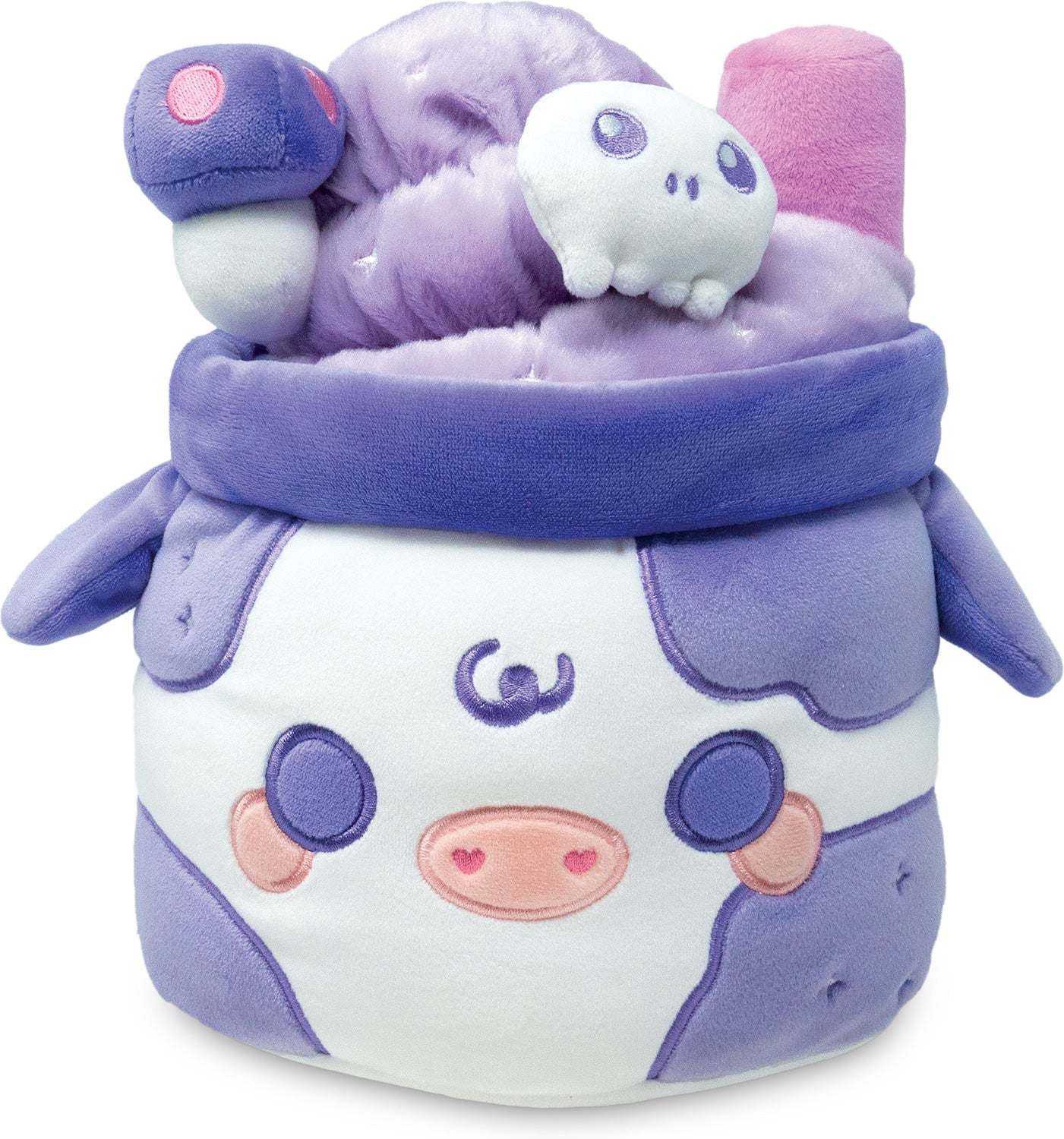 Double double, toil and trouble, we want a spooky plush to cuddle! Enter Witchy Brew Mooshake! Sitting at an impressive 11" tall, this kawaii-inspired purple plush is irresistibly soft and satisfyingly squishy. The adorable embroidered face, floppy little ears, and plush skull and mushroom details make this sweet cow treat udderly perfect for kids and adults who love magic.