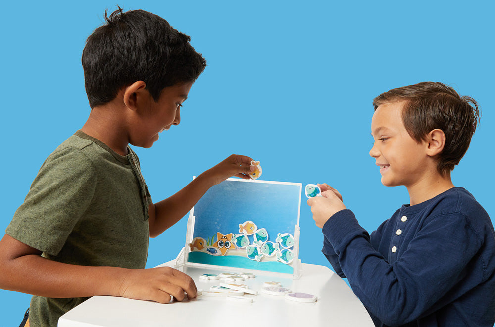 No floundering, just strategy with a modern twist. Take turns dropping your own fish into the aquarium, trying to connect 5 of them, and block other's paths with the sea creatures. The fish will bounce in unexpected directions, so it's not as easy as it might appear. Starfish, seahorses, and clams may get in the way of your fish family formation. For 2 players.