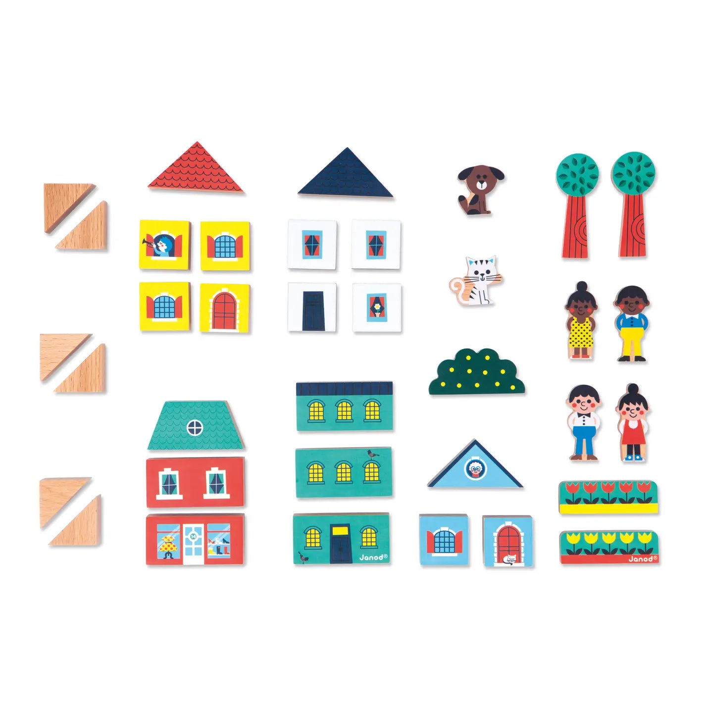 A one or two-story house? A colored, pitched or flat roof? This set of 38 solid wood pieces is ideal for planning and building little one’s dream city. It includes 27 building blocks, 5 decorative elements and 4 characters. The clever storage box with its sliding lid can be used to store all the pieces like a puzzle. Simply follow the diagram on the bottom of the box. The ideal toy for developing imagination. Wooden construction toy for children ages 2 and up. Combine this set of blocks with a mat and cute vehicles in the same Janod range to perfectly complete the universe.