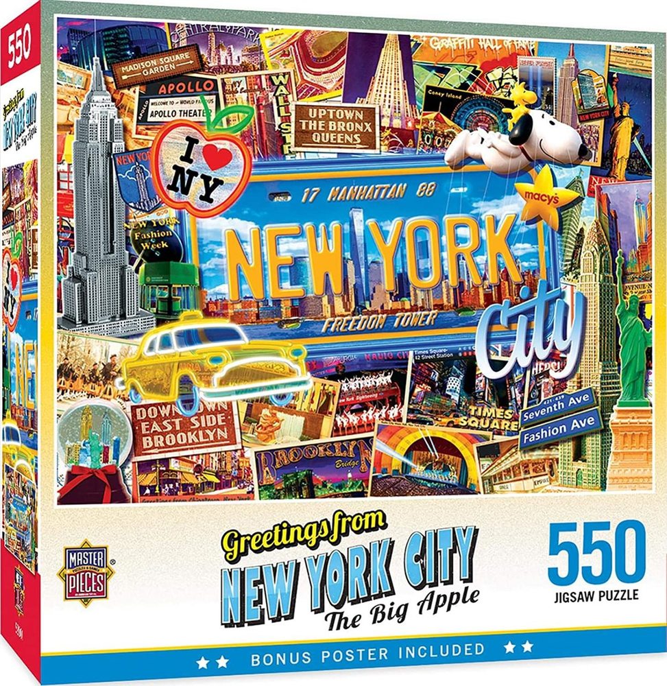 This MasterPieces New York 550 Piece Jigsaw Puzzle. Measuring 24" x 18", this captivating puzzle is perfect for both children and adults aged 14 and up. As you piece together the iconic cityscape, feel the energy of the city that never sleeps come to life. But it's not just the puzzle's beauty that sets it apart – it's also eco-friendly. MasterPieces takes pride in using recycled chipboard material, ensuring a reduced impact on Masterpieces environment.