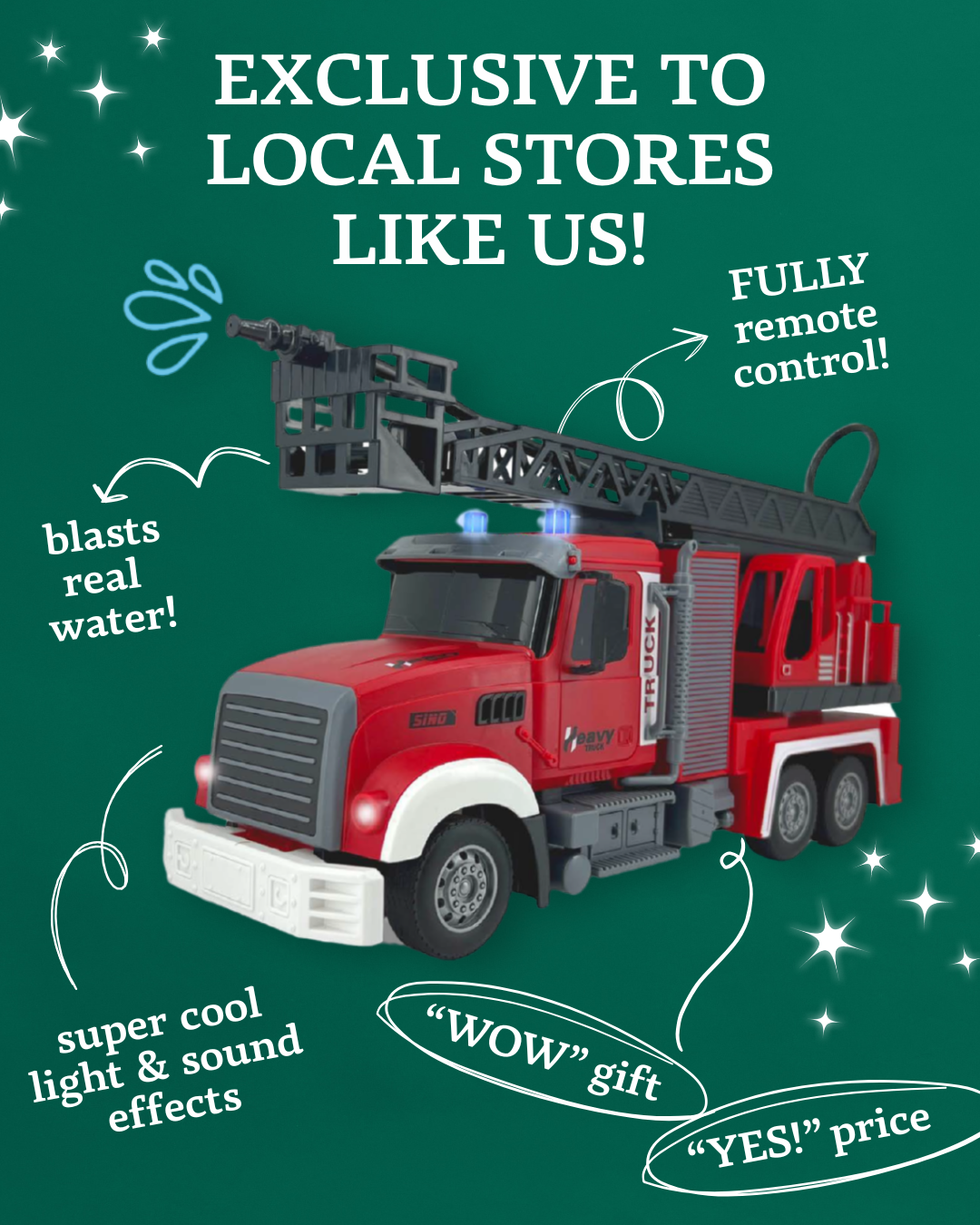 Future firefighters, get ready to save the day! This remote-control fire truck works just like the real thing! Put young heroes in control of the action as they use the handheld controller to experience all the action of a real firetruck. Drive forward, reverse, and turn with precision, activate flashing lights and sirens, extend the ladder, and spray real water from the hose, just like the pros! Includes a rechargeable USB battery for the truck and requires 2 AA batteries, not included, for the controller. Perfect for young heroes ready to take command!