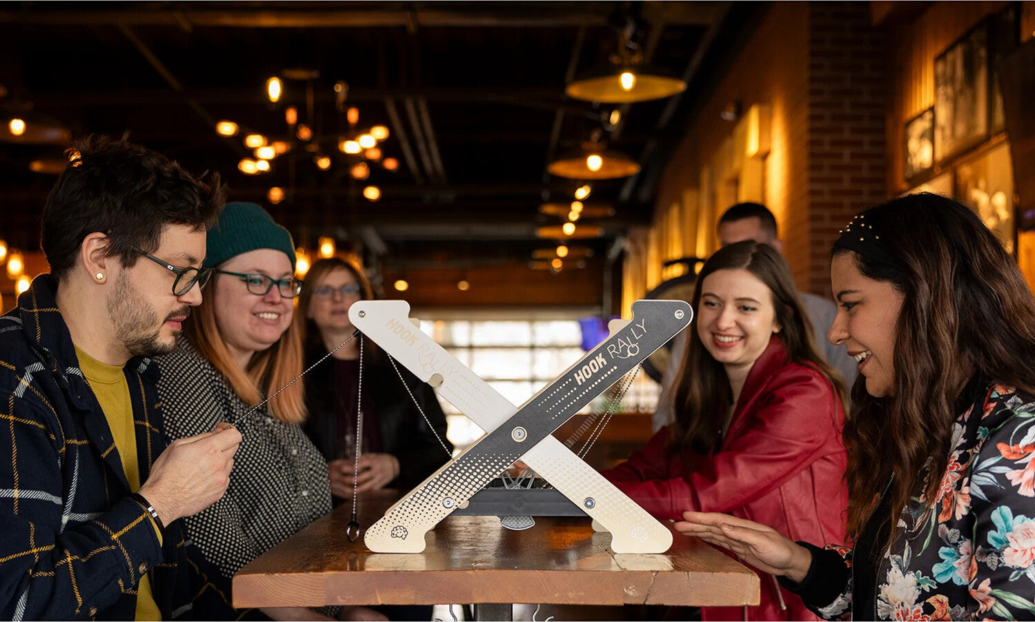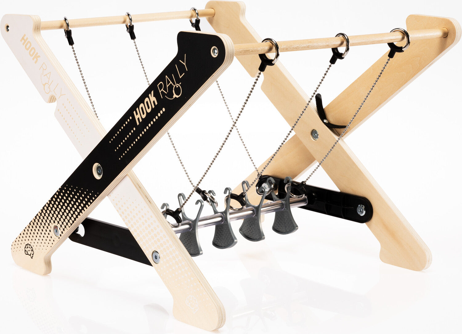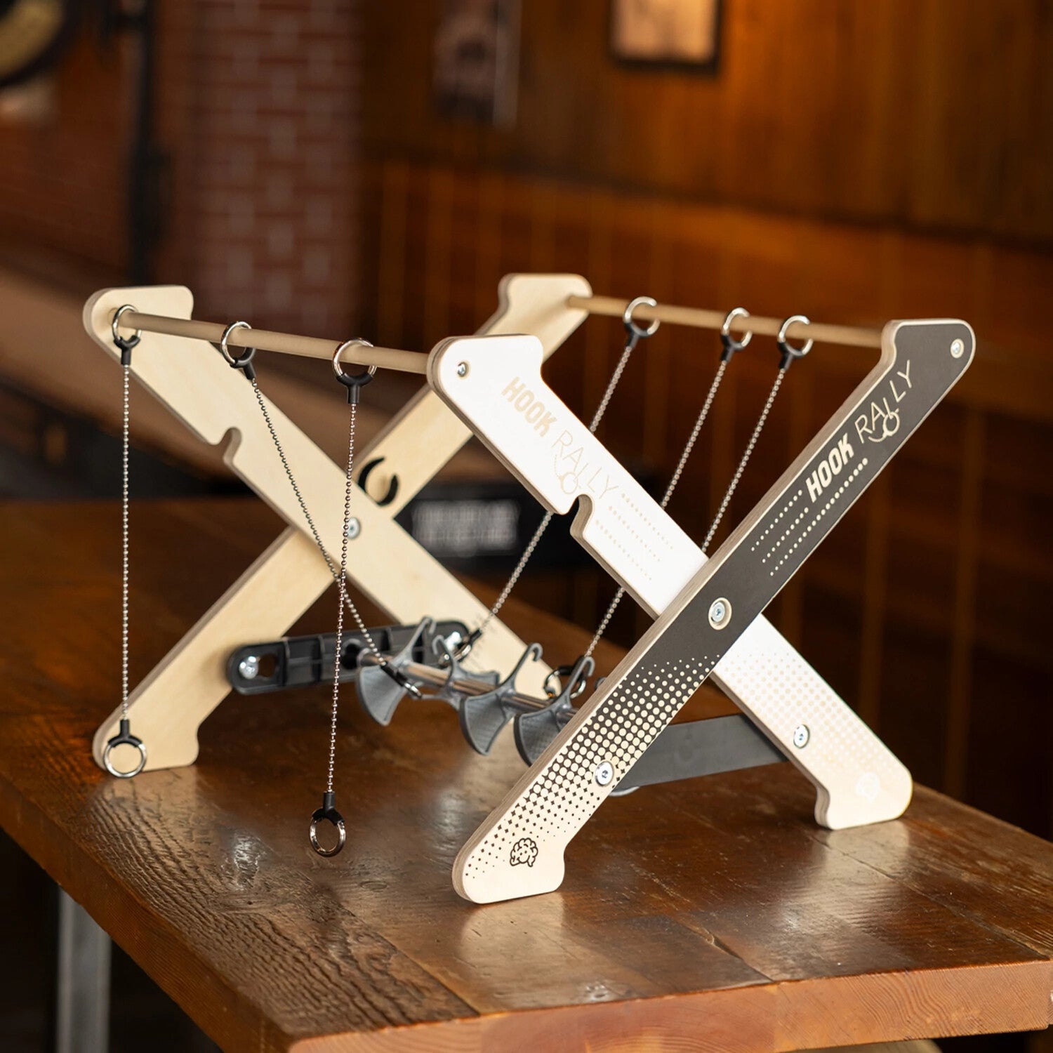 Players take positions on opposite sides of the game and start at the same end, so you're both competing for the same hook. Then, start swingin' to try and capture the hooks. Once you capture a hook, your opponent can't reach it. If you knock a ring off a hook you already captured, you've got to go back and recapture it (before your opponent does). The first to snag three hooks wins! Fast-paced, uniquely challenging, and foldable for easy storage, Hook Rally is an instant family favorite!