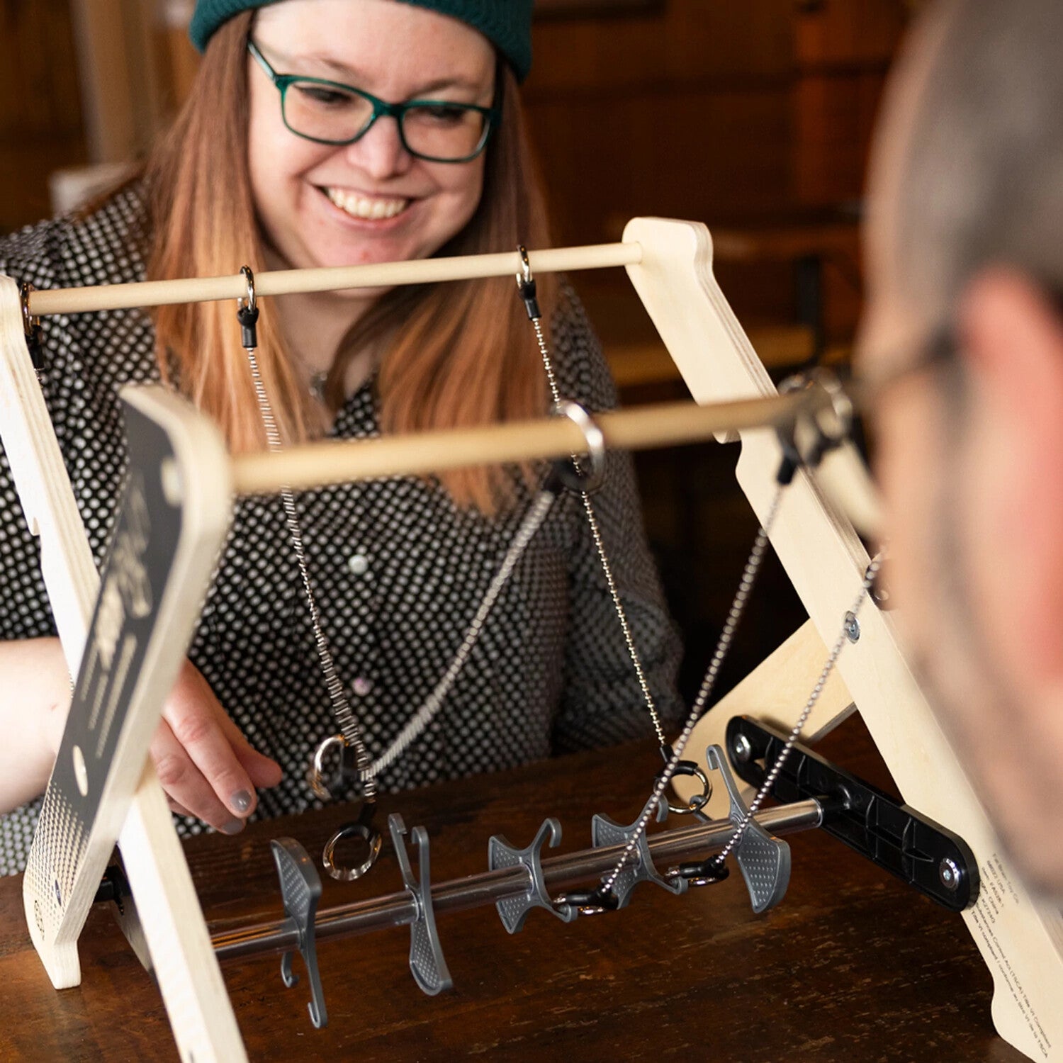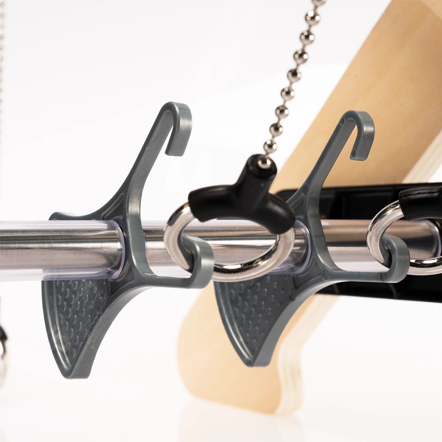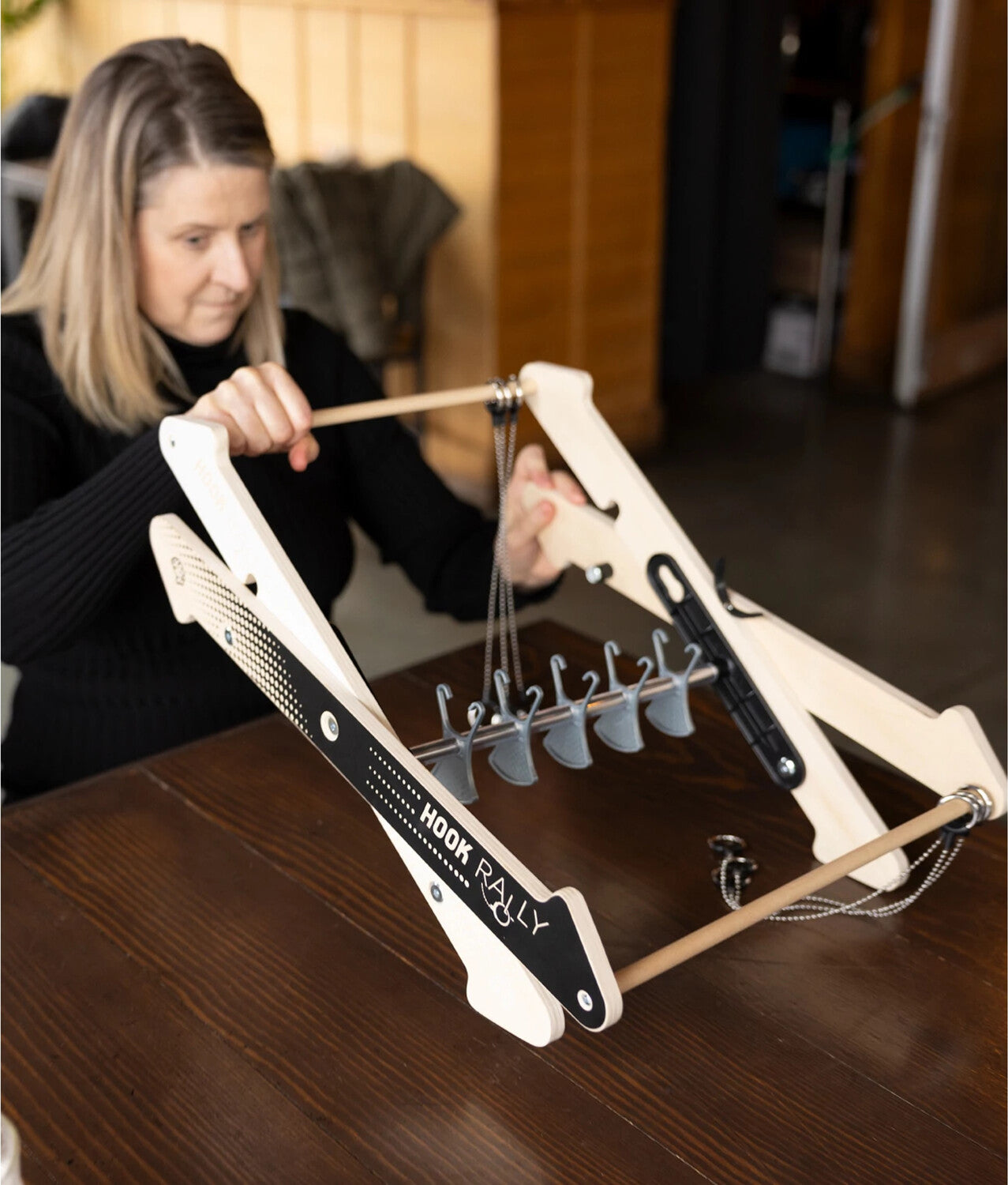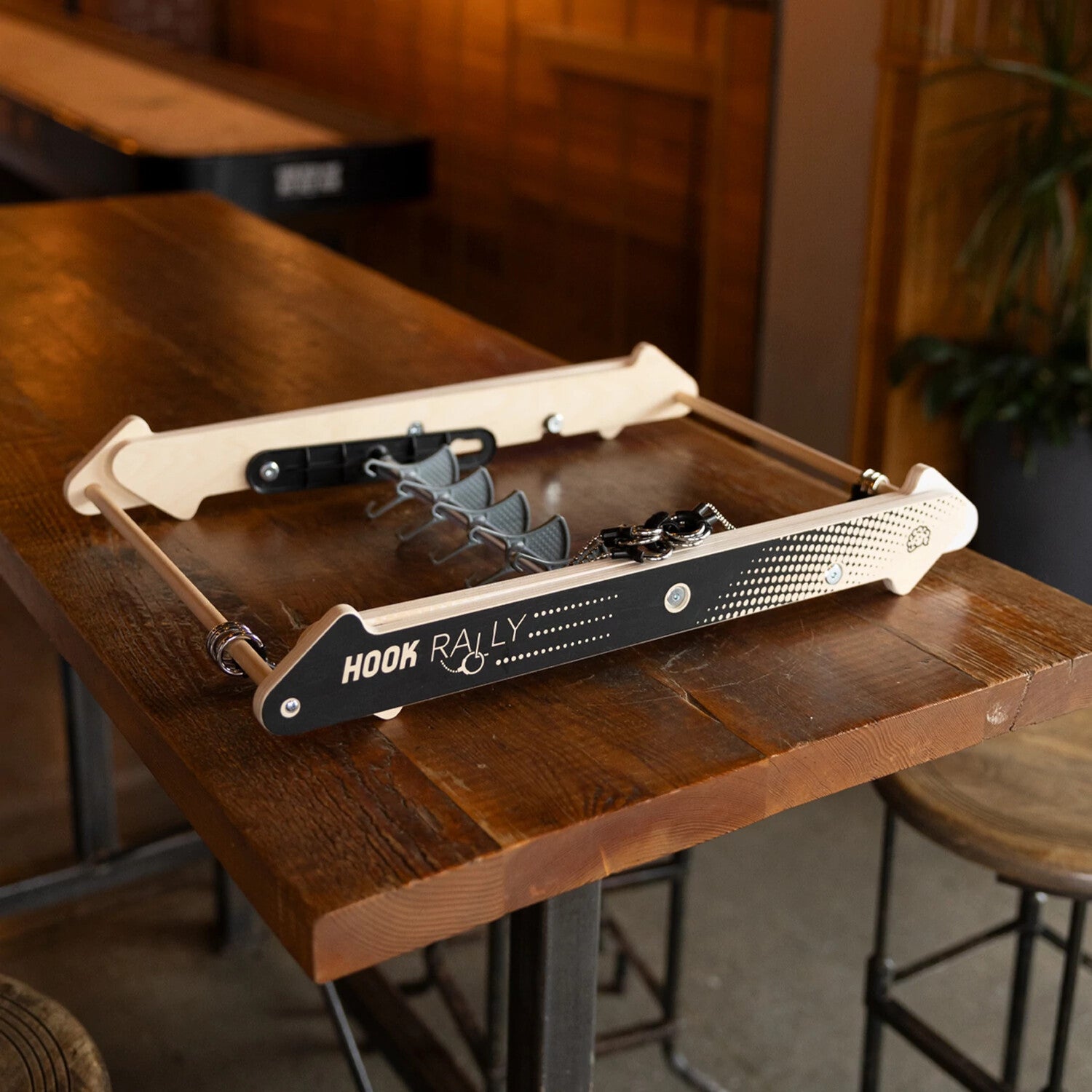 Players take positions on opposite sides of the game and start at the same end, so you're both competing for the same hook. Then, start swingin' to try and capture the hooks. Once you capture a hook, your opponent can't reach it. If you knock a ring off a hook you already captured, you've got to go back and recapture it (before your opponent does). The first to snag three hooks wins! Fast-paced, uniquely challenging, and foldable for easy storage, Hook Rally is an instant family favorite!