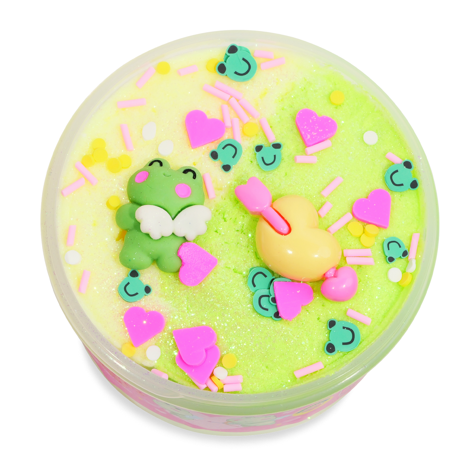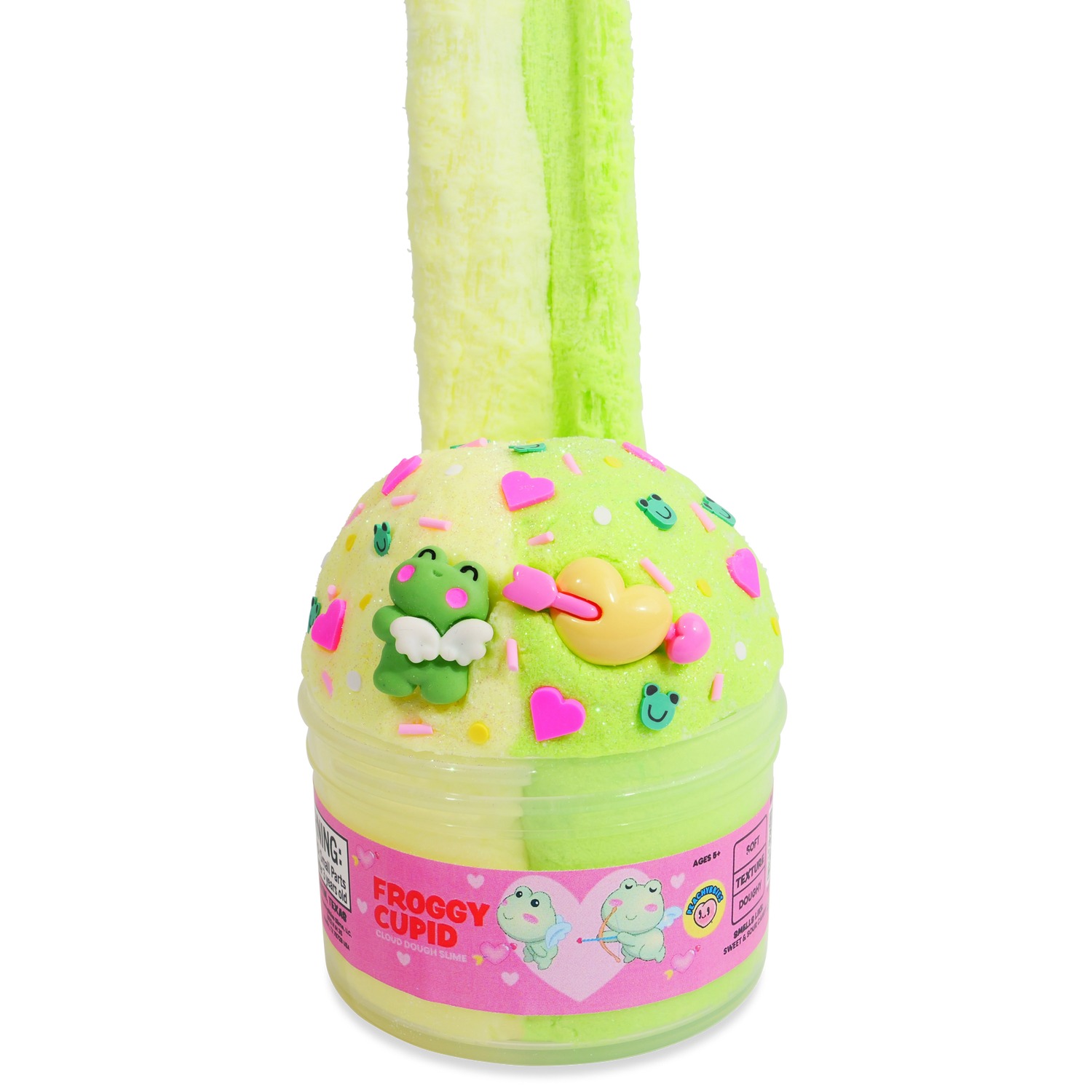Cloud dough slime with a softy, doughy texture and sweet and sour candy scent. Complete with cupid froggy charms and mix-ins.