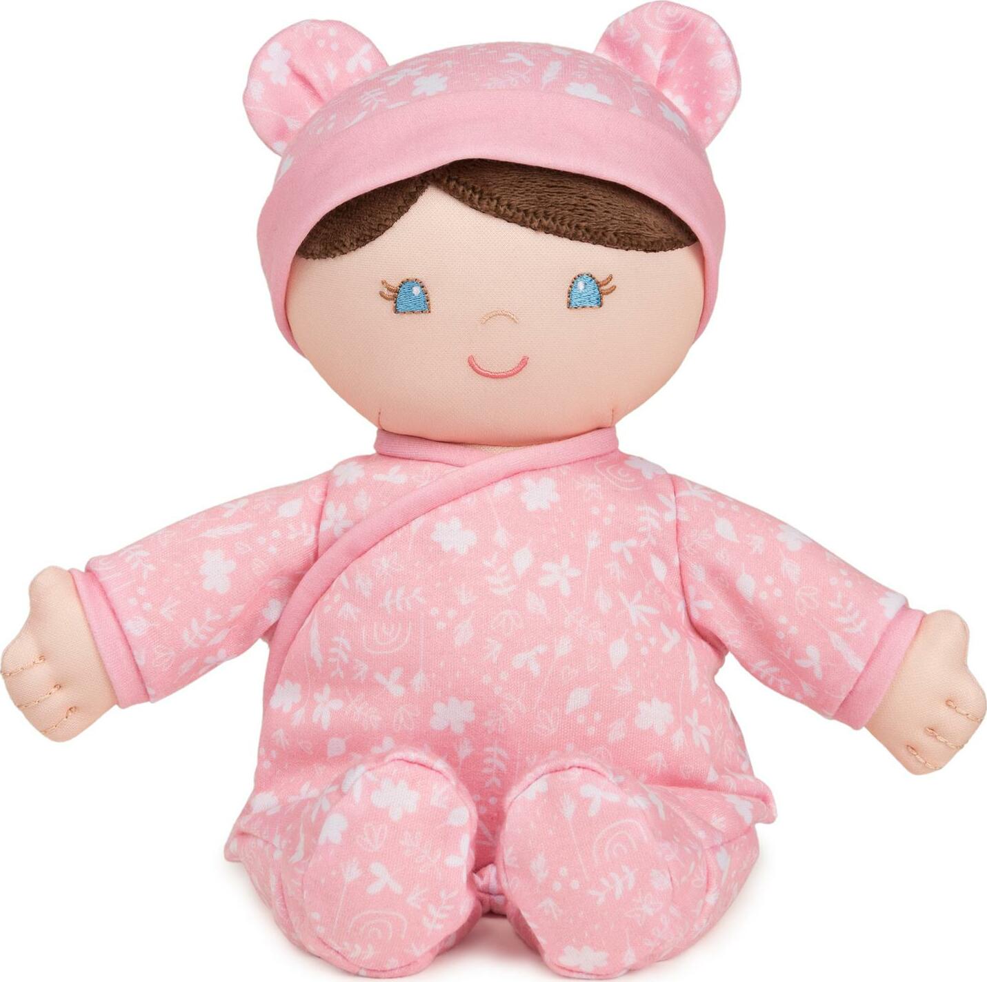 - 100% RECYCLED PLUSH BABY DOLL: This 12' plush doll is crafted from recycled materials, including the stuffing in its playfully plump-yet-floppy body. Rosabella has a soft pale pink floral-pattern onesie and a cute matching hat with teddy bear ears.