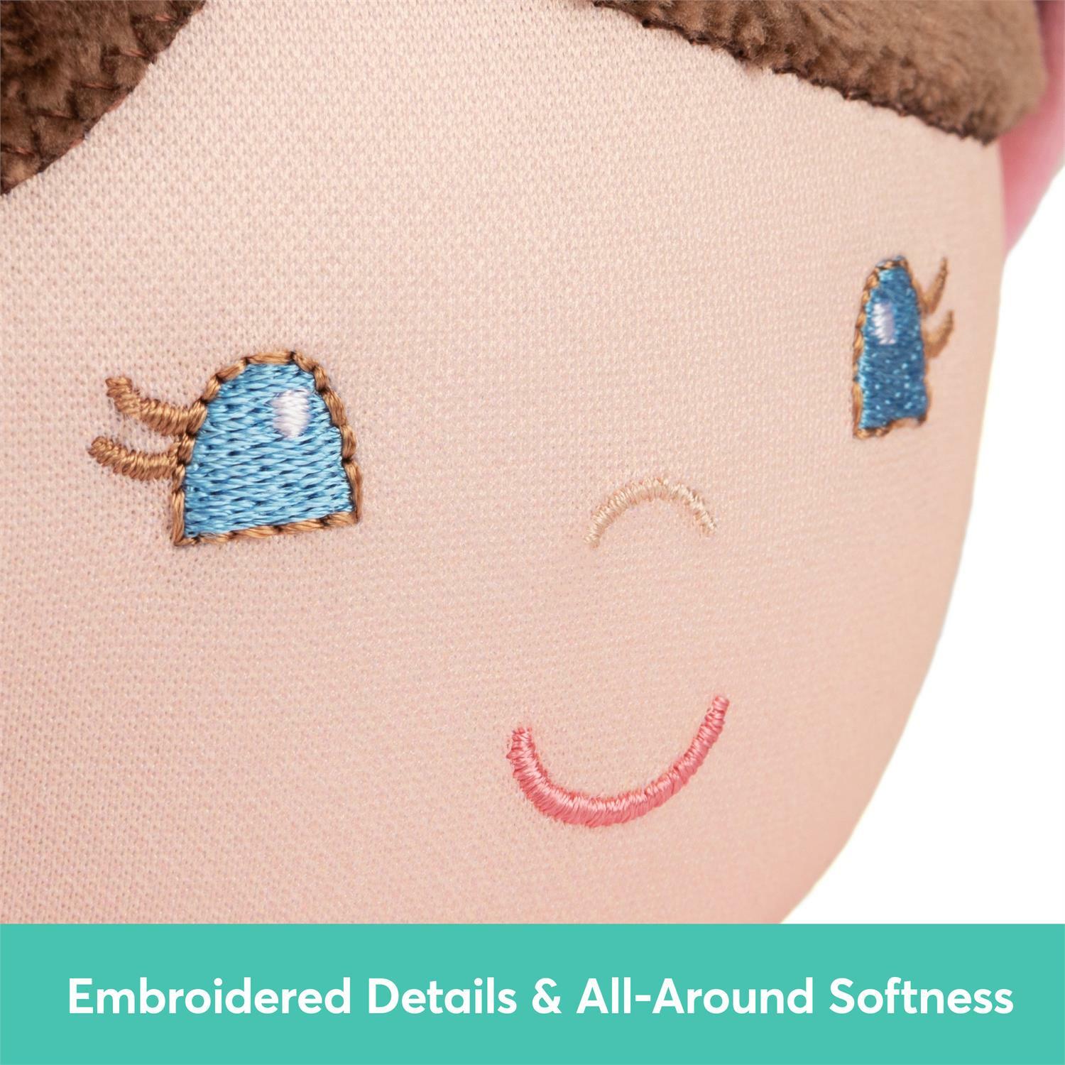 Each doll is crafted consciously with care, all-around softness, and a floral-patterned onesie outfit in an array of modern colors. They feature huggable and perfectly plump, playfully floppy bodies and hands crafted for little ones to hold easily, which makes them perfect partners for on-the-go play. Each doll features embroidered facial details and is perfect for all ages, newborns and up. Every component of the doll is crafted with recycled materials, including the fiber fill, recycled thread, and fabrics.