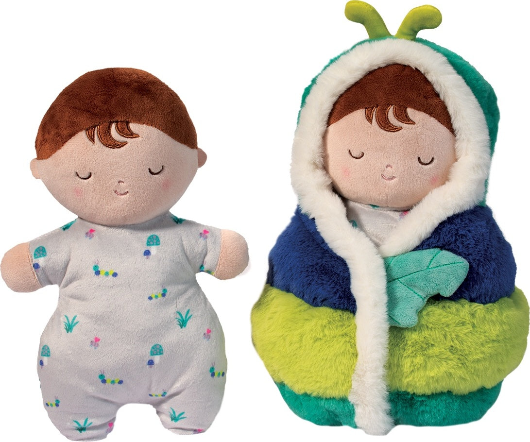 With its whimsical design and ultra-soft features, this interactive cuddle buddy is sure to become Baby’s favorite companion. Gently wrap the Baby doll in the cozy, plush swaddle, fastened with a closure adorned with an embroidered caterpillar design. Soft, colorful segments resembling a caterpillar’s body run along the back, while tiny embroidered antennae add extra charm. The gentle, snuggly fabrics and sweet details make this toy perfect for both soothing naps and imaginative playtime.