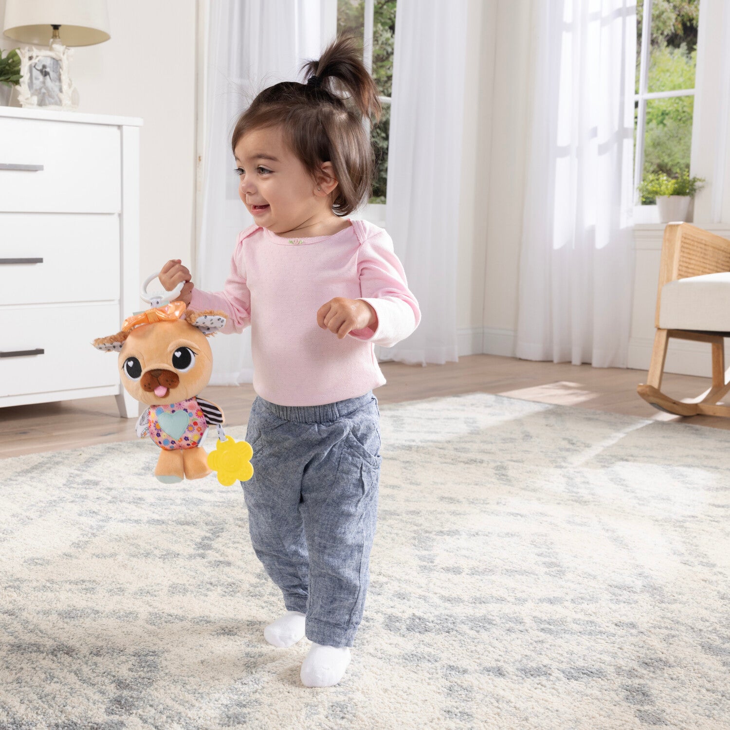 Your little one is sure to have a paw-some time with Lamaze's Lovey the Pug travel toy! This cute little pug features bright colors and shapes and has a soft body with multiple textures for baby to explore. You can squeeze Lovey to show baby how she squeaks, which is a fun way to introduce early cause and effect learning. She also has a pretty flower tethered to her hand that is perfect for grabbing and chewing.