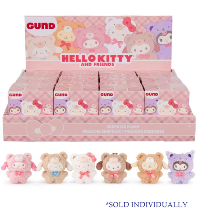 SOLD INDIVIDUALLY, these 3.5" blind box toys feature Hello Kitty, My Melody, Cinnamoroll, Pochacco, Kuromi, and Pompompurin dressed as cuddly teddy bears - no one knows which one you will get!