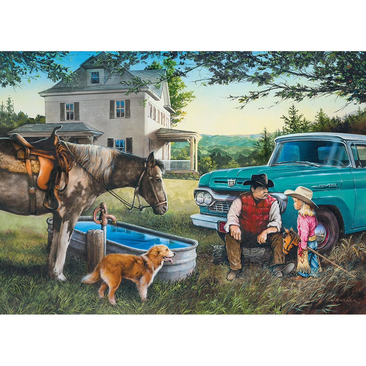 This MasterPieces 19.25" x 26.75" 1000pc Childhood Dreams Puzzle was masterfully created by artist, Dan Hatala. Hatala brings memories of his rural upbringing to life with highly detailed images of small town scenes. In the Childhood Dreams series, he is particularly focused on depicting special moments between parents and their children. This image, entitled "Cowboy Dreams" shows an adorable little girl, with a toy horse and a full cowboy get-up, standing with her father and his fully grown, real horse. Nothing will bring a family closer than this heart-warming, family-friendly puzzle! To reduce its impact on our environment, the chipboard used in this puzzle is made of recycled material.