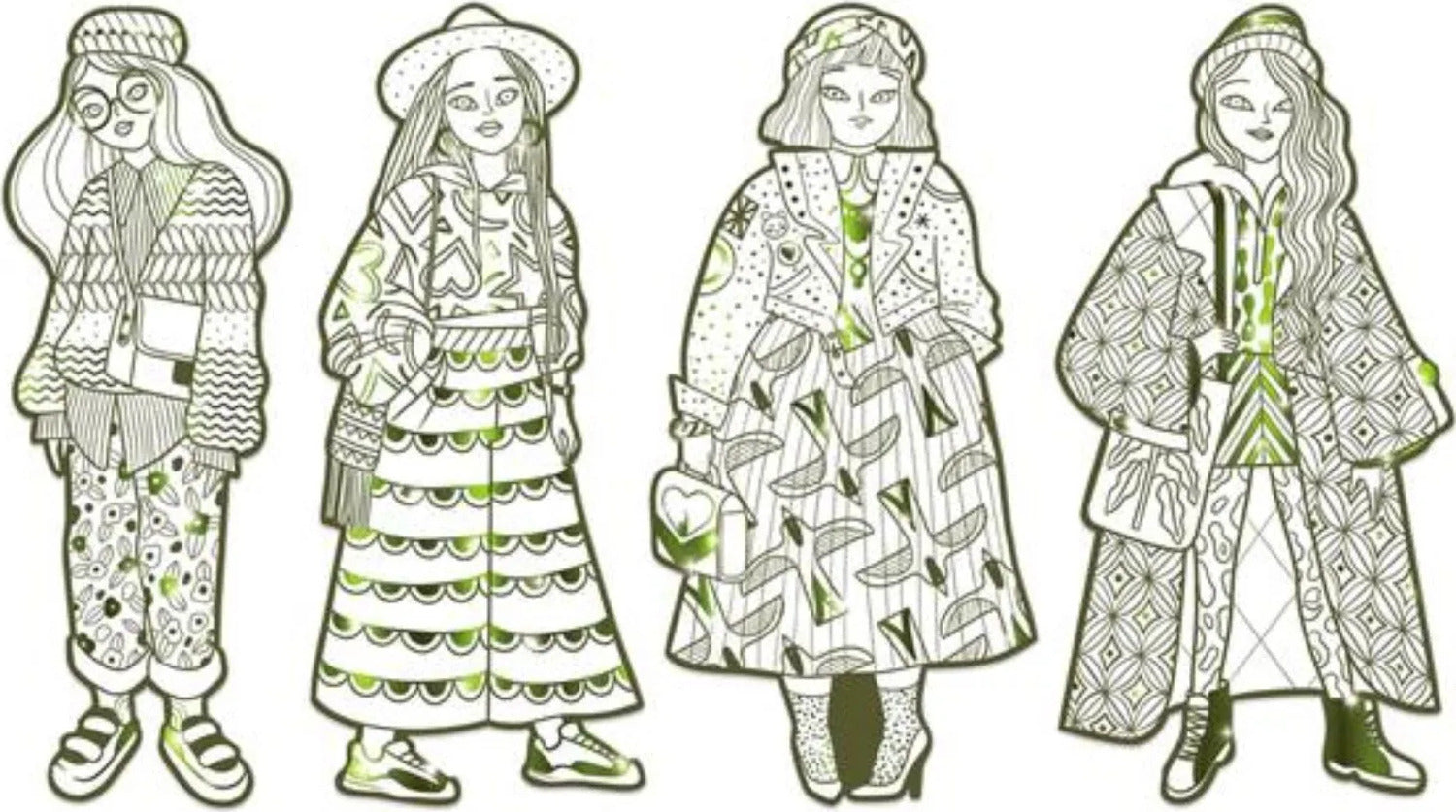 A parade of girls wearing colorful outfits for you to color in however you'd like! Four large outlines offer outfits covered in patterns and adorned with metallic areas to make the models look even better!
