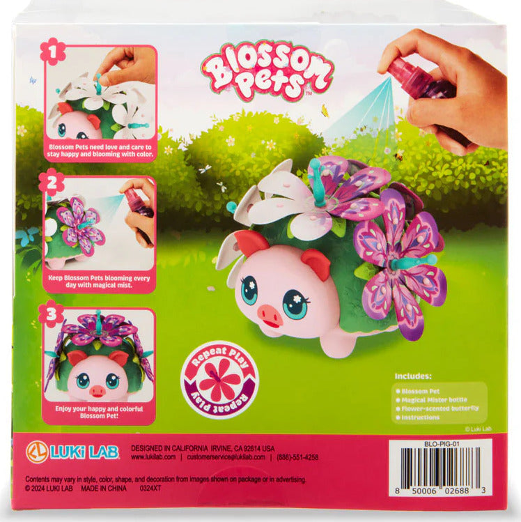 Daisy the Pig features four beautifully detailed fabric flowers. Simply spray her flowers with a light mist of water and see her vibrant colors appear! When the flowers dry, mist them again and again to reveal their color and keep Daisy blooming. Includes 4.5” pet, mister bottle, and flower-scented butterfly that attaches to the flower stem.