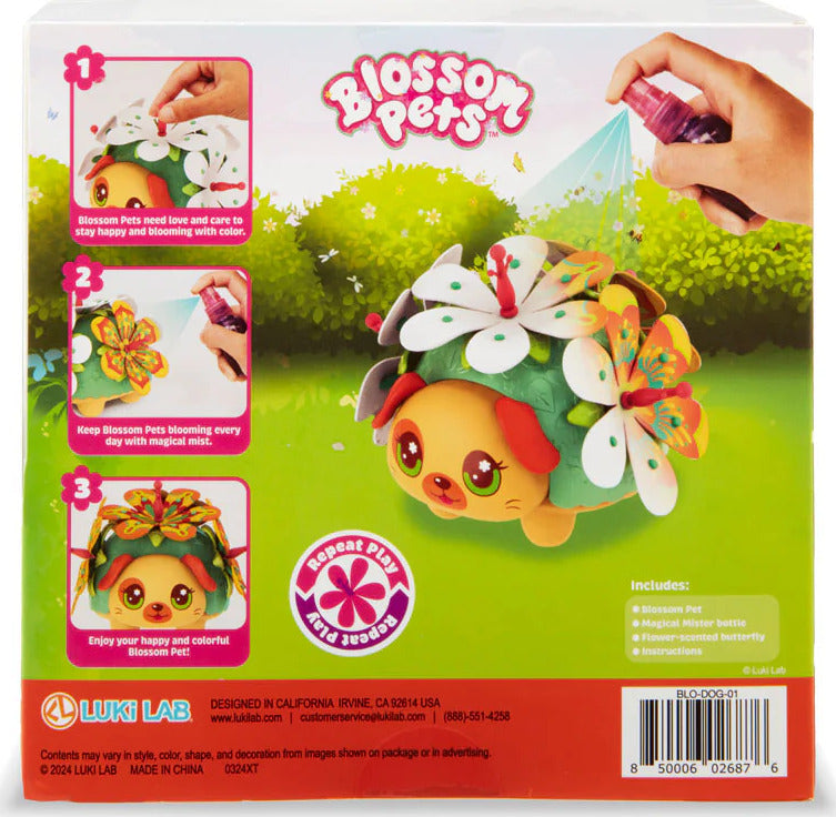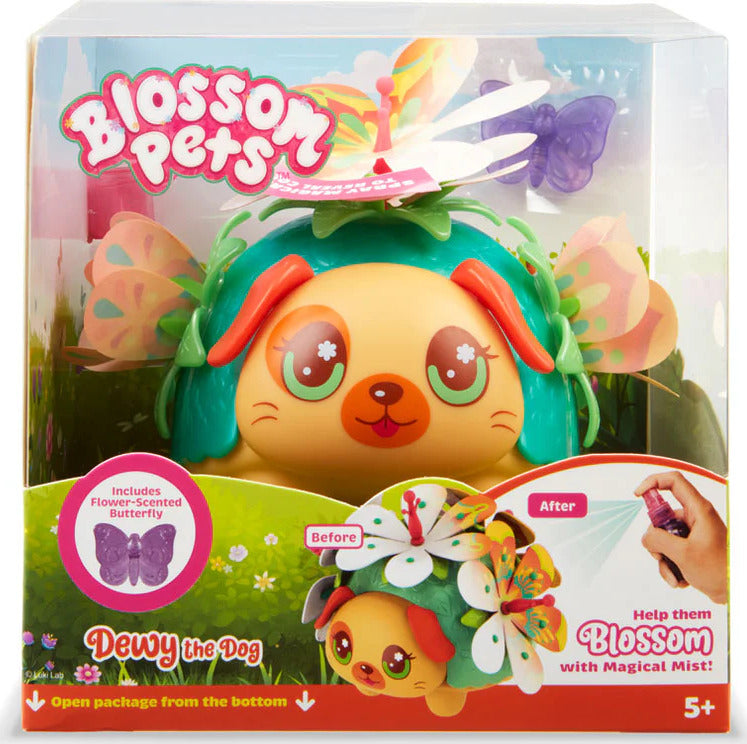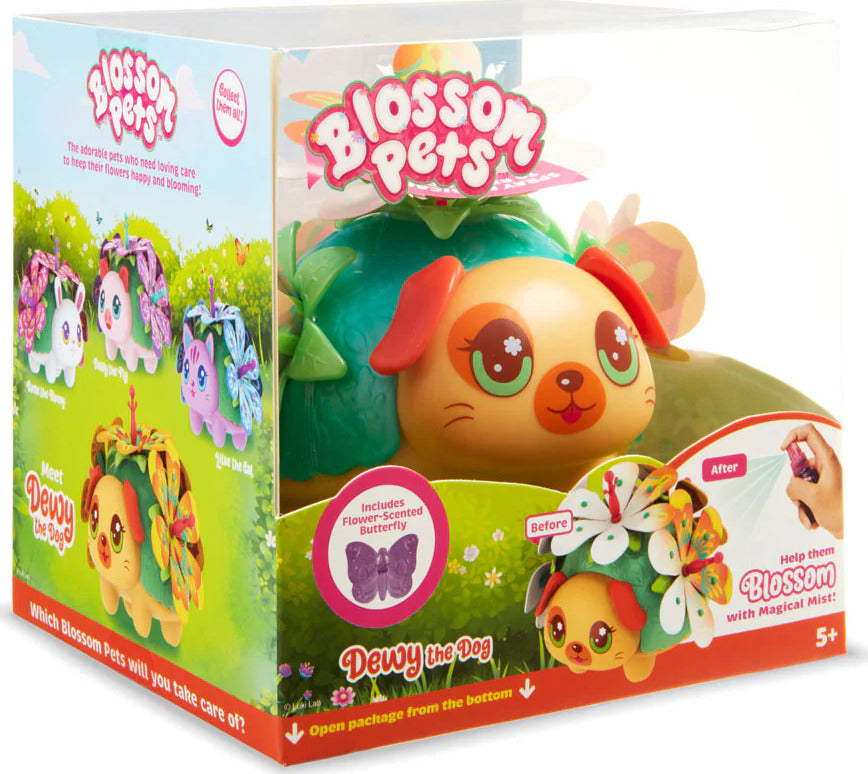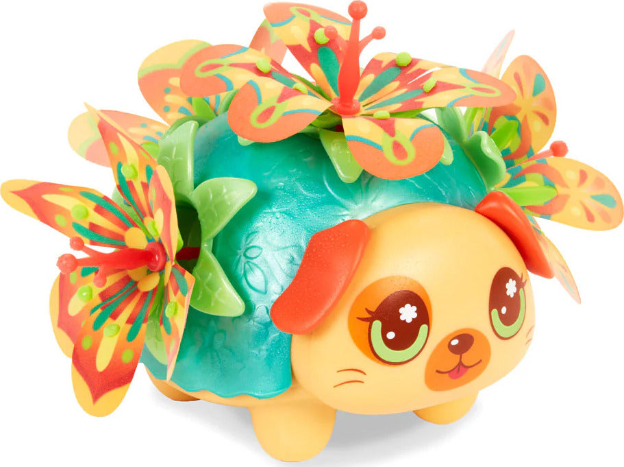 Dewy the Dog features four beautifully detailed fabric flowers. Simply spray his flowers with a light mist of water and see his vibrant colors appear! When the flowers dry, mist them again and again to reveal their color and keep Dewy blooming. Includes 4.5” pet, mister bottle, and flower-scented butterfly that attaches to the flower stem.