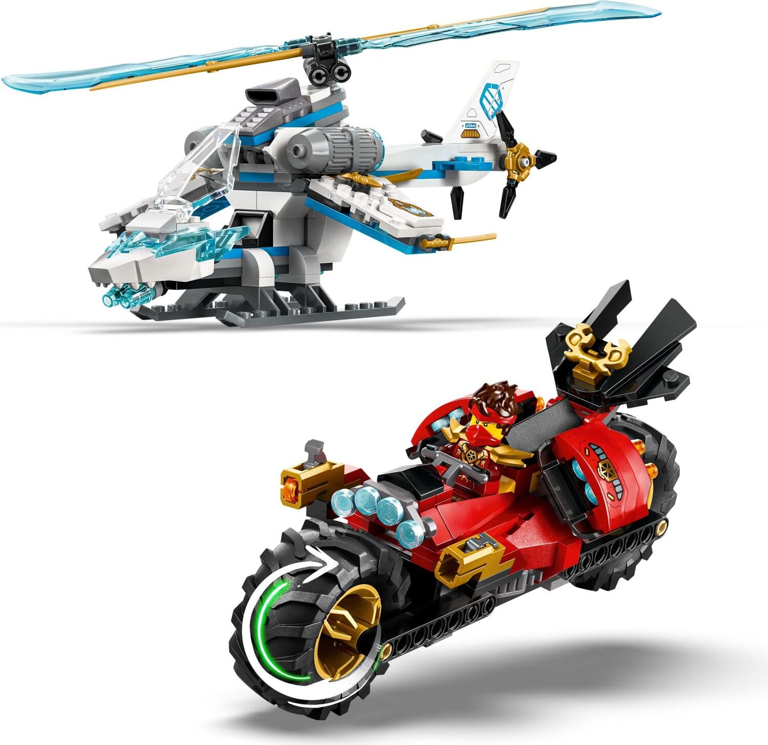 • 2 NINJA TOY VEHICLES – Ninja motorcycle toy has moving wheels, a saddle-cockpit for a minifigure and 2 stud shooters, and the helicopter toy has an opening cockpit and rotating blades