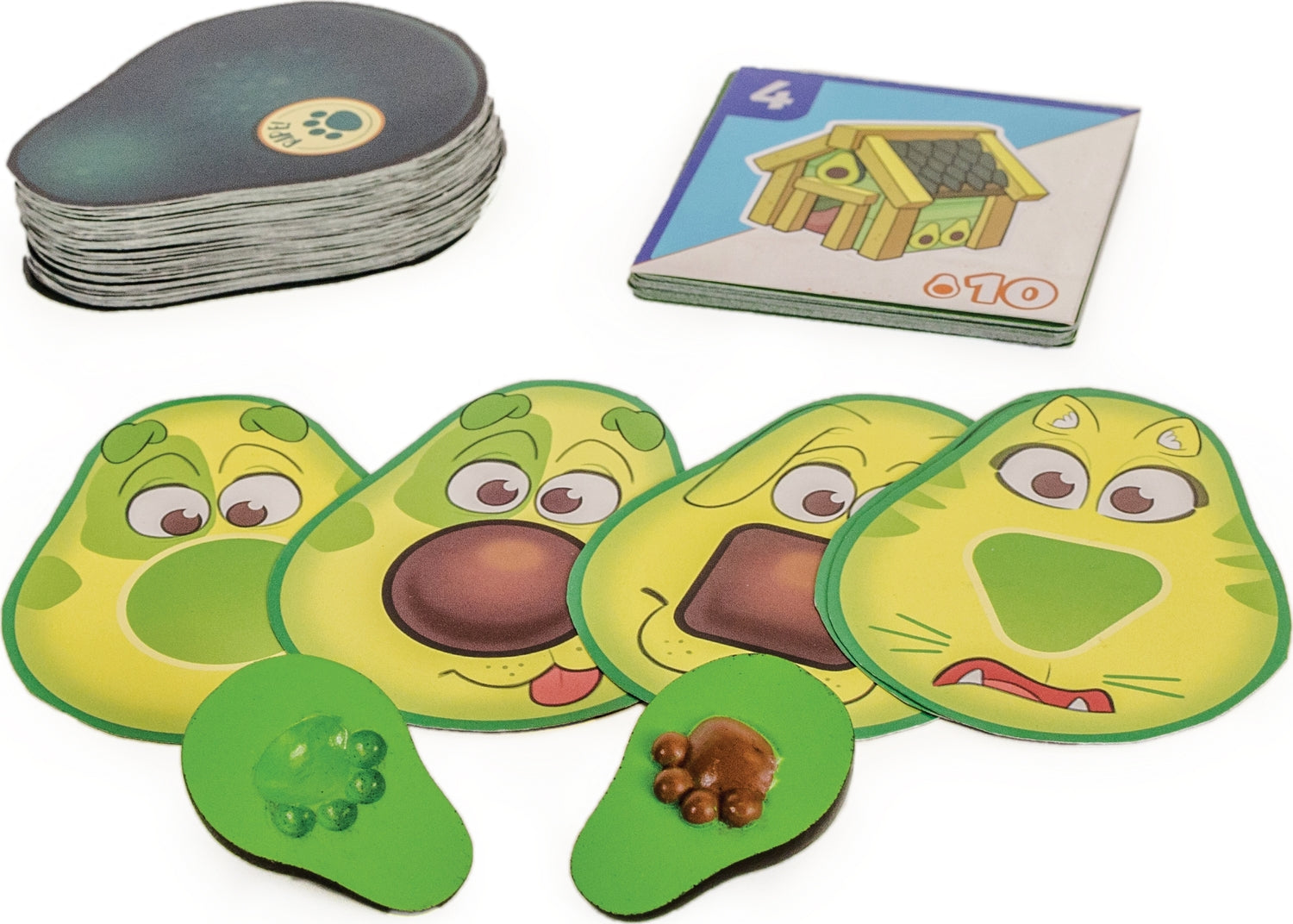 Pawvocados is The Game of Pawesome Pairs! The Pawvocado pets have lost their noses... these cute pups, cats, and bunnies will need your help to find their Pawvocado pair and get their nose back. On each turn, roll the original avocado dice: the adorable fruit will break open and may reveal the little paw seed! Which side you land on will determine how many cards you win. Make pairs with your cards or exchange them for fun items to delight your avocado buddies.