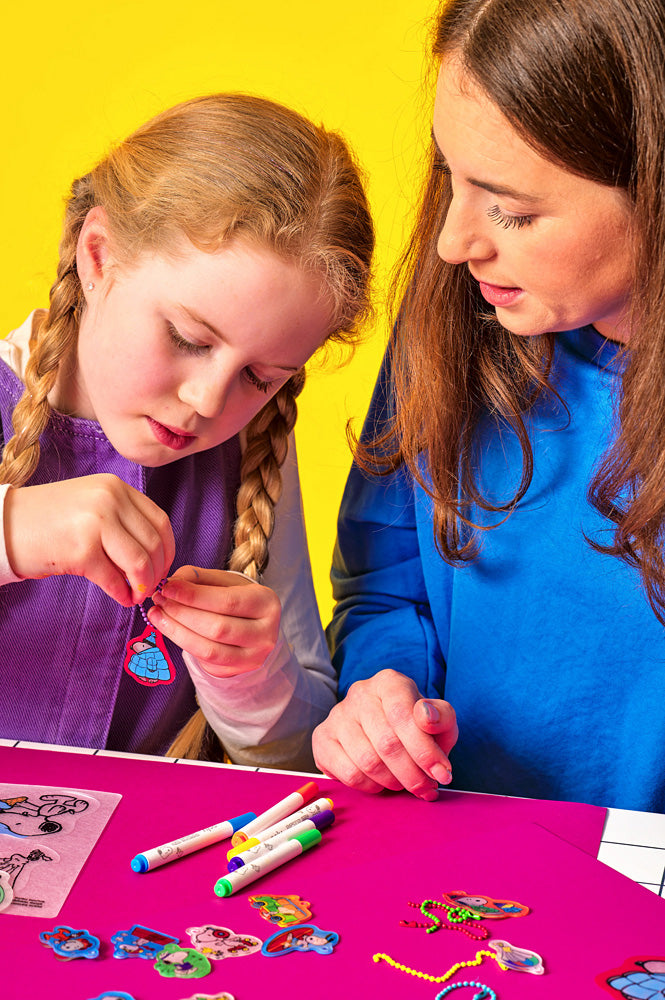 Peanuts fans enjoy unplugged creative time coloring Snoopy and Woodstock charms, shrinking them down in the oven, and stringing them to make keychains, bracelets, and more. Everything's included to get crafting right away: 20 punch-out designs on printed shrink art plastic, 3 colors of cord, and 5 ball chains. Adult supervision required when using the oven!