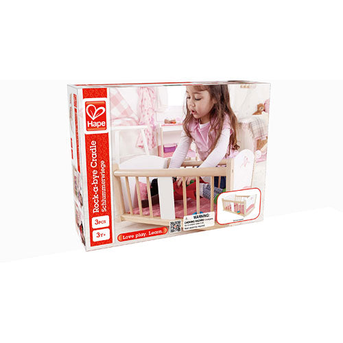 When Dolly gets tired and cranky, Hape's Rock-a-bye Cradle will put him or her soundly to sleep. If Dolly's more restless than usual, why not sing a soothing lullaby or two? Hape's Rock-a-bye Cradle has a rounded bottom for gentle rocking, a fluffy mattress pillow to keep Dolly comfy, and a ring toy to entertain Dolly when Mommy is away. The cradle is crafted with sustainability and Hape's high standards in mind, with solid Maple, Baltic Birch plywood, and a child-safe finish. For ages three years and up. Doll not included.