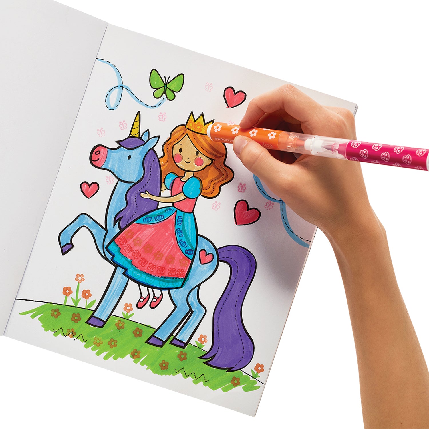 - Set of 18 markers with a brush tip on one end and a stamp on the other