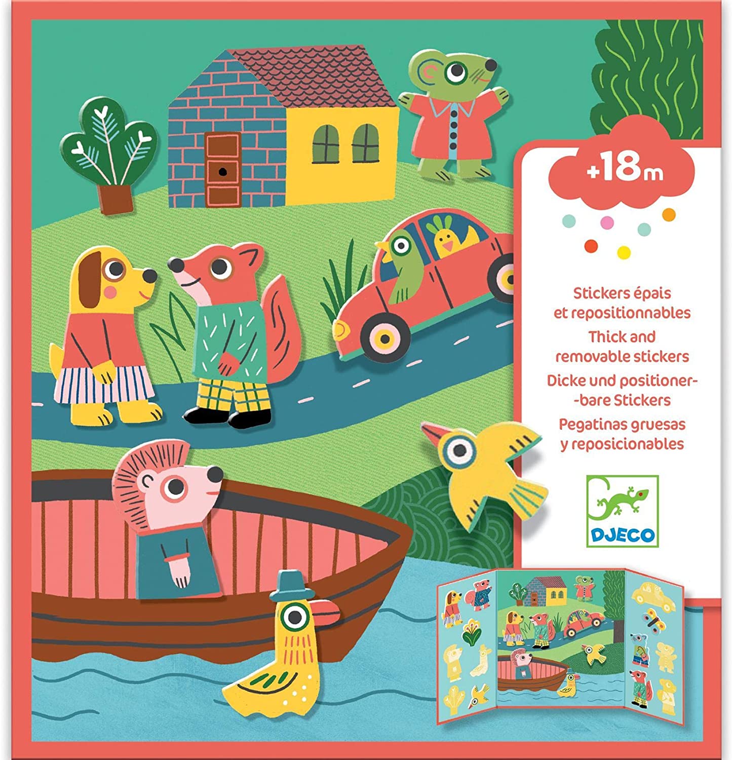 Take your favorite animal friends into the country, maybe for a ride in the boat, use the 14 repositionable stickers to create your animal world, it’s a modern day take on classic colorforms