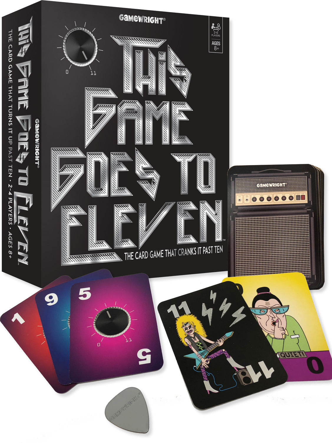 Turn it up! In this fully-amped card game, the goal is to crank up the volume and stick other players with cards. Play number cards to a center pile, adding up the total along the way. Make the pile hit exactly 11 and hand the whole heap to another player. But crank it too loud and you get stuck with the headache! End the game with the fewest cards and you totally rock!