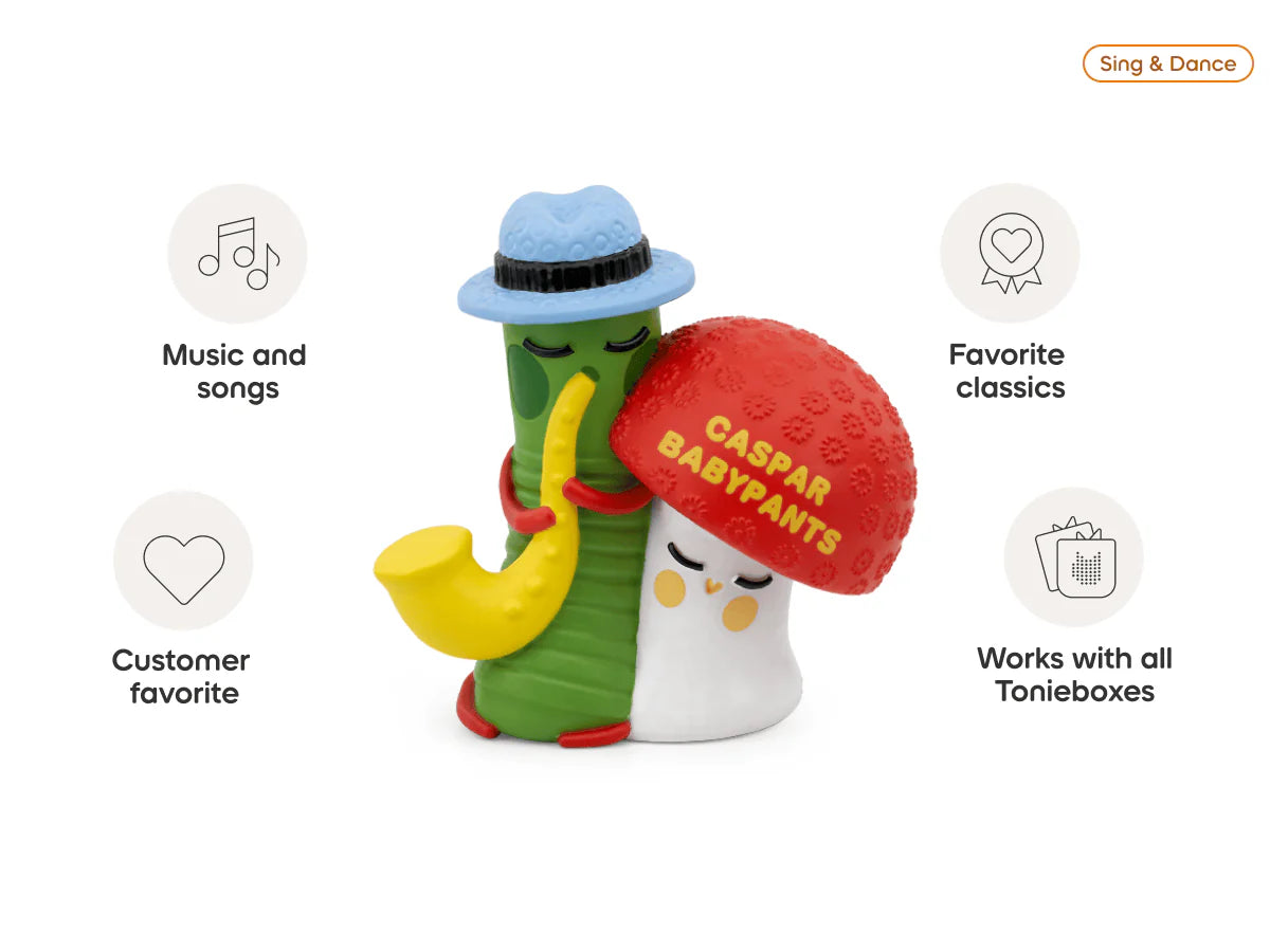 Get ready to wiggle, giggle, and groove! This Caspar Babypants Tonie features a joyful collection of playful, catchy songs that invite little listeners to dance, move, imagine, and explore. Caspar Babypants has released 19 albums with family-favorite hits like β€œRun Baby Run” and β€œStompy The Bear” that appeal to both kids and parents alike. His bright acoustic-based music is the perfect way to enjoy songs together as a family. Whether it’s a dance party or everyday play, these tracks inspire creativity, movement, and big smiles!